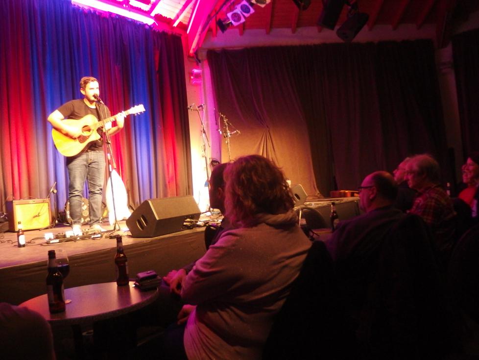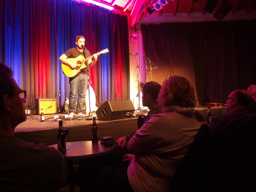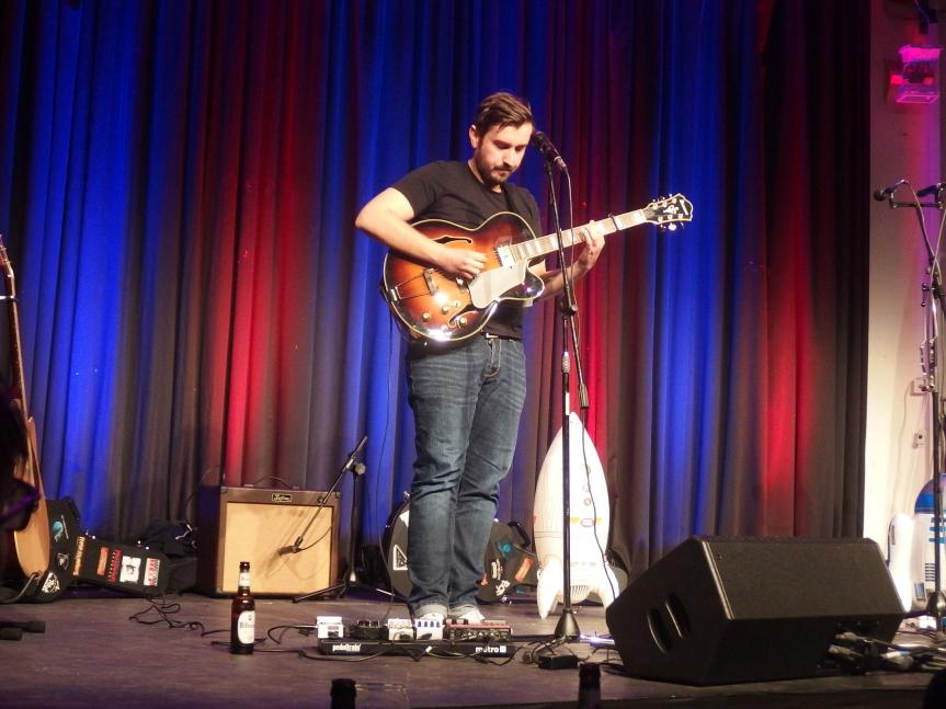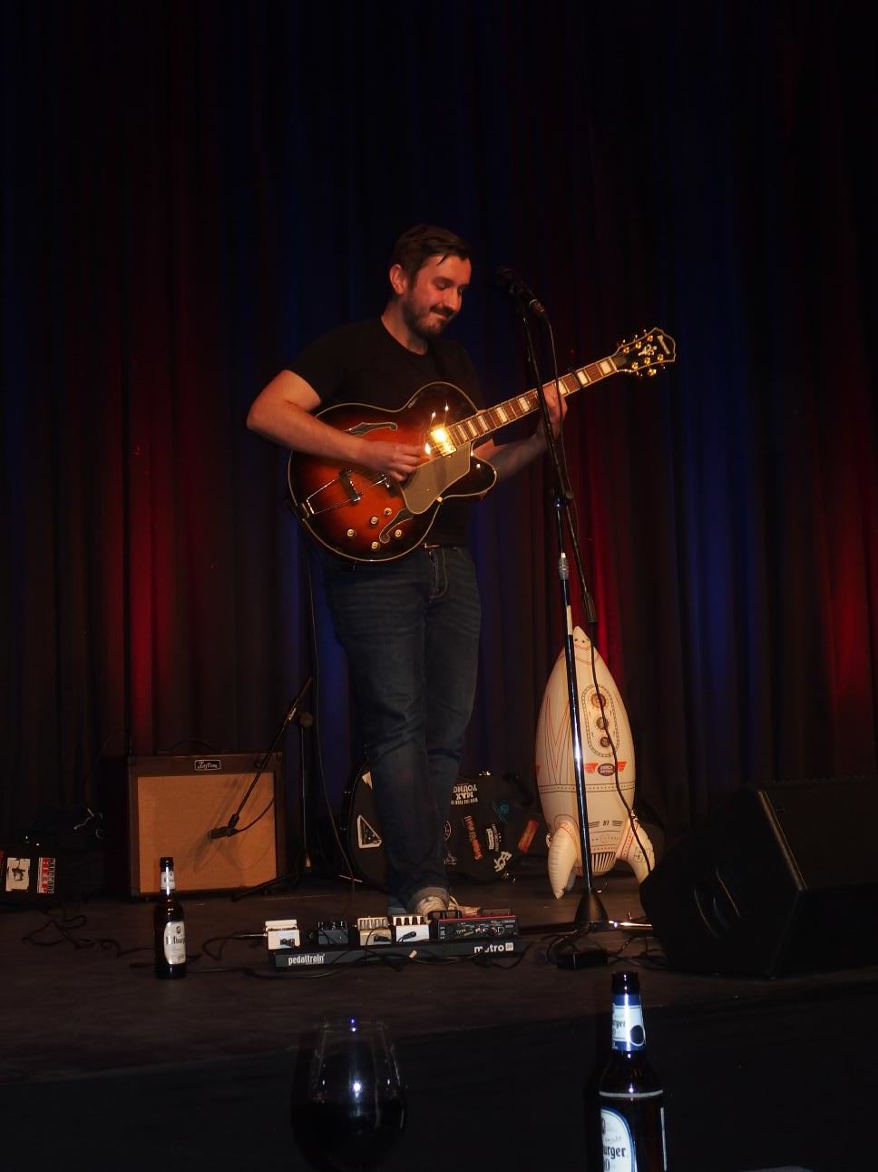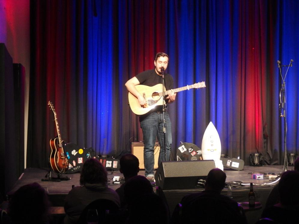 Gregor McEwan hat damit sicherlich nicht so viele Probleme. Immerhin redet er auf der Bühne auch mit Fabelwesen, wie R2D2, den er mit auf Tour nimmt, damit er sich nicht so einsam fühlt. Die aufblasbare Variante passt auch bequem in den Rucksack. Am Anfang hatte ich noch meine Bedenken, denn das erste Lied, da sang er mit so einer hohen Stimme, und ich dachte ich werde mal wieder Opfer davon, mir nie die Künstler anzuhören, die ich besuche. Aber noch mal Glück gehabt, das war der einzige Ausfall (aus meiner Sicht). Aber was dies zeigte: Gregor McEwan hat ein unglaubliches Stimmvolumen. Seine Stimme kann wechseln, nicht nur effektgesteuert, sondern auch im Song. Das Effekltgerät ist trotzdem wichtig, denn so werden Intros angesteuert und die Unterhaltungen mit R2D2 geführt. Ab und an durchbricht auch mal ein E-Gitarrenakkord die Stille. Denn das Publikum, wie Tim auch schon anmerkte, ist an diesem Abend sehr leise, ohne allerdings gelangweilt zu sein. Dafür macht sich McEwan doch etwas über sie lustig, als er beispielsweise Instagram erklärt (ohne zu Wissen, dass der Rezensent gerade dort gepostet hat). Ansonsten lässt er uns aber auch teilhaben an seinem Leben und ruft dazu auf, heute vor allem Schallplatten zu kaufen, denn Midsummer-Records-Boss ist da und der hat die ja schließlich auch released.