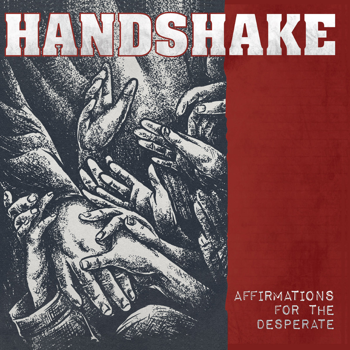 Wow, da flattert mir aber eine schöne Platte in’s Haus! Die Debüt-EP der neuen Allgäuer/Münchner Hardcore-Combo Handshake, welche auf den Namen Affirmations For The Desperate hört und über Choke Records erschienen ist, sieht optisch schon mal klasse aus. Der Vinyl-Hype zieht natürlich auch nach sich, dass jede noch so kleine Band ihre Musik auf die Frisbees pressen lässt, was mich in den meisten Fällen auch total freut. Dass bei der Vielzahl an Veröffentlichungen auch einige nicht konsistent in Cover, Aufmachung und optische Ausrichtung sind, ist auch klar. Die Fünf-Song-EP von Handshake ist jedoch genau das: Konsistent, in sich schlüssig. Mit einem schicken Cover – eine schwarz-weiß Zeichnung mit rotem Rand und fettem Bandlogo – welches sofort in’s Auge springt und einer unaufgeregten Vinyl-Farbe (clear oder clear mit rotem Splatter) weiss die Aufmachung mehr als zu überzeugen. Das Ganze ist zudem Inside-Out bedruckt und es liegen ein DIN A2 Plakat sowie ein Lyric-Sheet dabei – besser geht es nicht, da hüpft mein Vinylnerd-Herz.