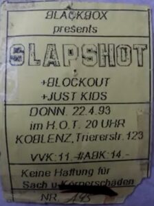 Olei: Meine erste Hardcore-Show war im Frühjahr 1993. Da spielten Slapshot im HOT in Koblenz. Die Band sowie den Jugendclub gibt es heute noch! Sogar mein Slapshot Longsleeve, was ich mir dort gekauft habe, gibt es noch. Ich war damals mit Thorsten da und seine Eltern haben uns gefahren. Anschließend sind wir mit Freunden zurück nach Limburg gefahren. Von dort aus ist Thorsten mit meinem Mofa zurück nach Hause gefahren. Im Hot habe ich tatsächlich mal gespielt, aber mit der Band Conmoto.