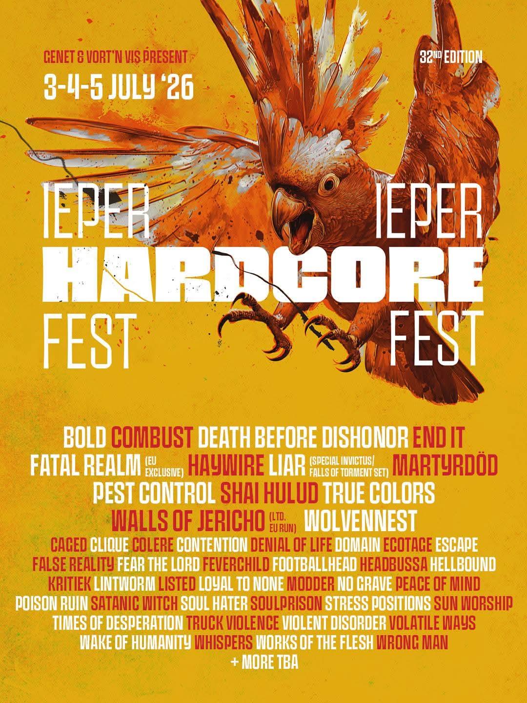 Bold, Caged, Clique, Colere, Combust, Contention, Death Before Dishonor, Denial Of Life, Domain, Ecotage, End It, Escape, False Reality, Fatal Realm, Fear The Lord, Feverchild, Footballhead, Haywire, Headbussa, Hellbound, Kritiek, Liar, Lintworm, Listed, Loyal To None, Martyrdöd, Modder, No Grave, Peace Of Mind, Pest Control, Poison Ruin, Satanic Witch, Shai Hulud, Soul Hater, Soulprison, Stress Positions, Sun Worship, Times Of Desperation, Truck Violence, True Colors, Violent Disorder, Volatile Ways, Wake Of Humanity, Walls Of Jericho, Whispers, Wolvennest, Works Of The Flesh, Wrong Man & more tba