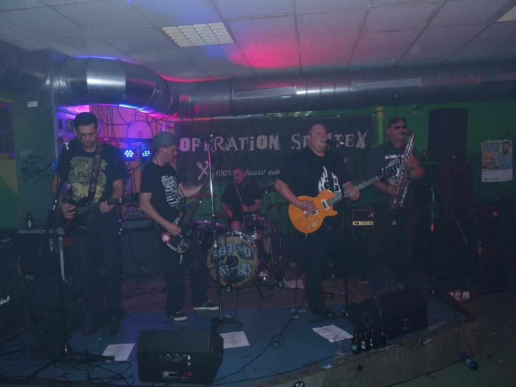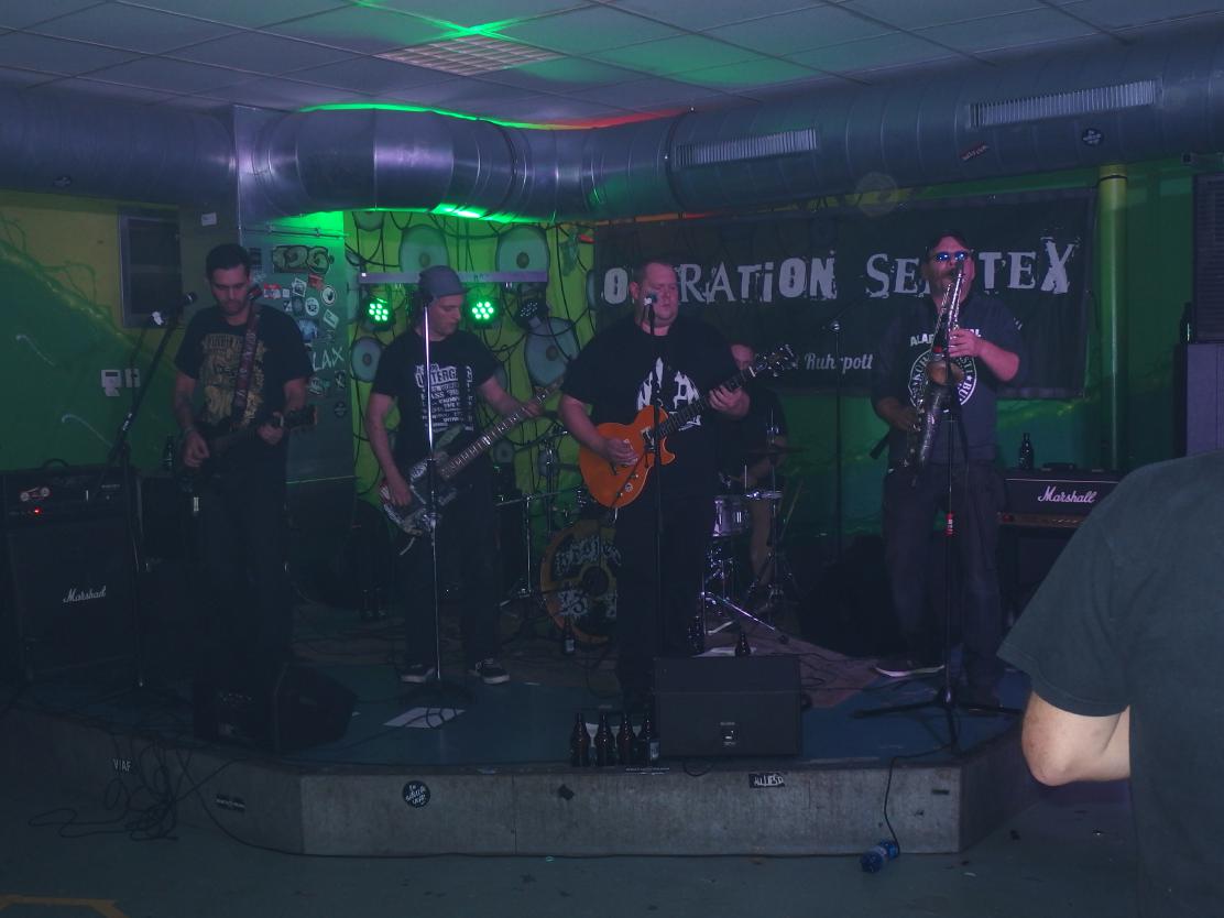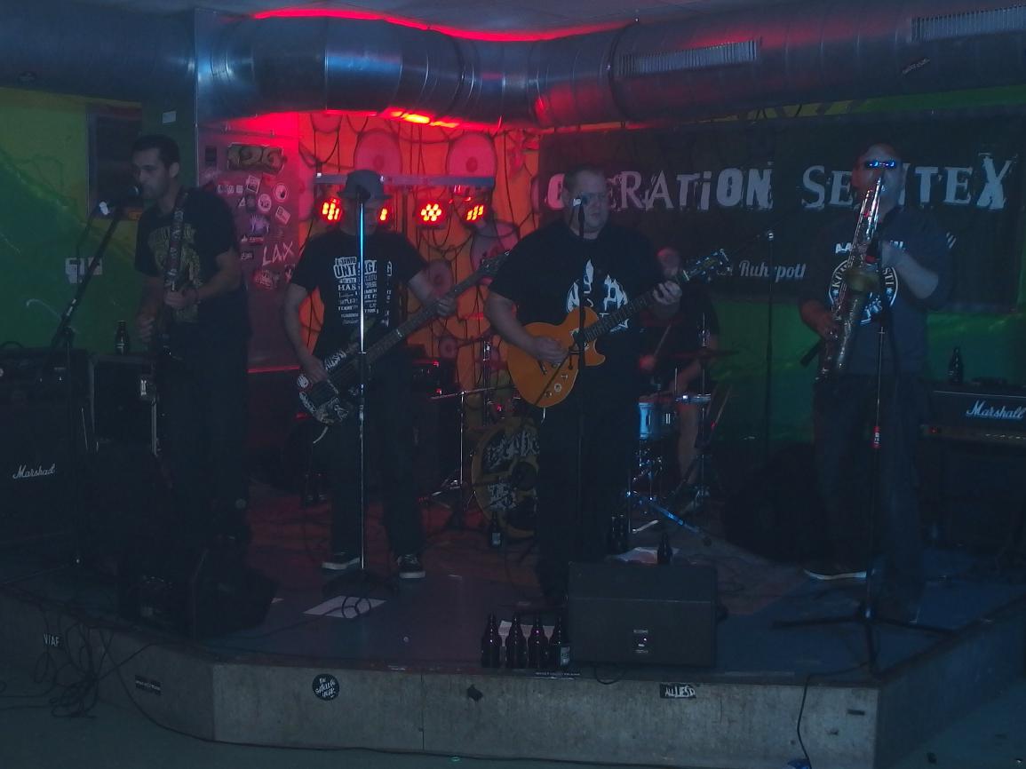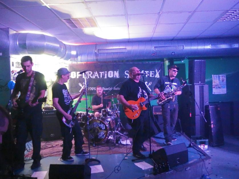 Aus irgendeinem Grund hatte ich Operation Semtex immer für eine Grauzonenband gehalten. Nun, falscher hätte ich damit wohl nicht liegen können, machte doch schon der Backdrop klar, dass es sich dabei um eine 100% antifaschistische Band aus dem Ruhrpott handelt. Musikalisch dachte ich am Anfang, dass sie zwar deutlich besser waren, als die Band davor (was nicht so schwer war), aber auch nicht wirklich erste Sahne. Aber da irrte ich mich, denn im Verlaufe des Gigs wurden die Songs immer besser. Vielleicht brauchten sie einfach ein paar Songs, um zueinander zu finden. Die späteren Tracks waren auf jeden Fall besser und haben mich ziemlich überzeugt. Langsam begann auch die Stimmung besser zu werden. Als Anheizer ziemlich cool.