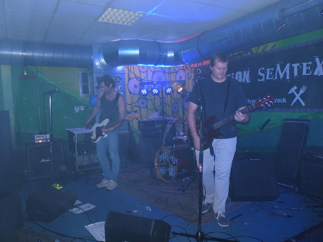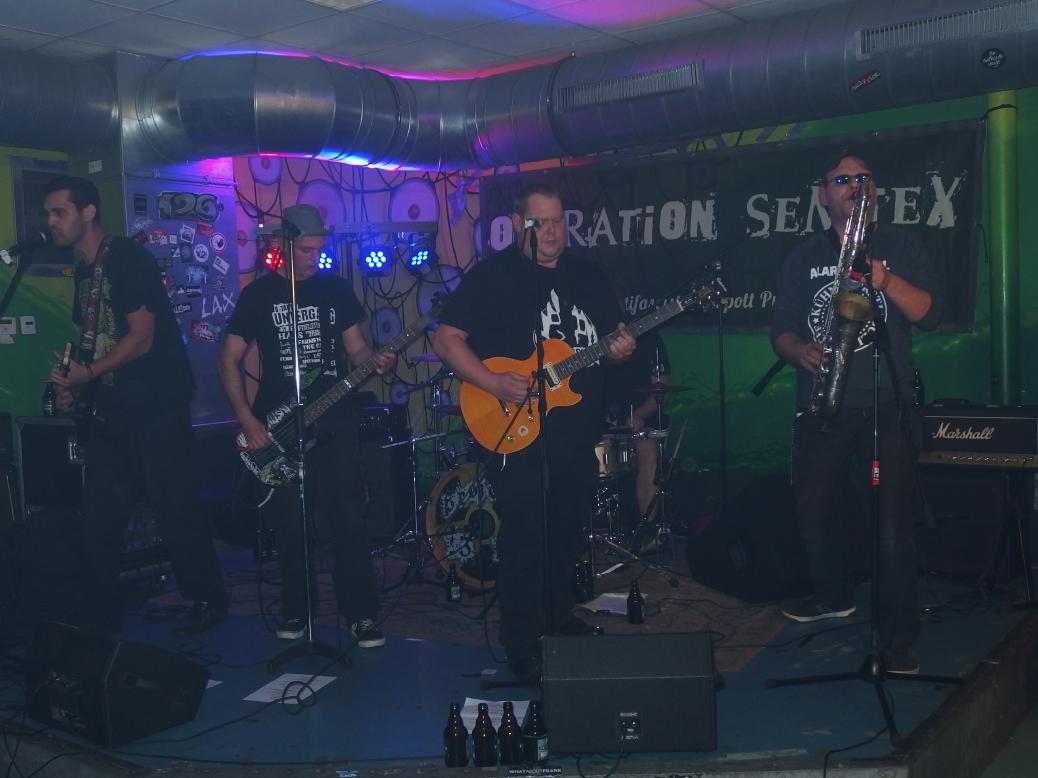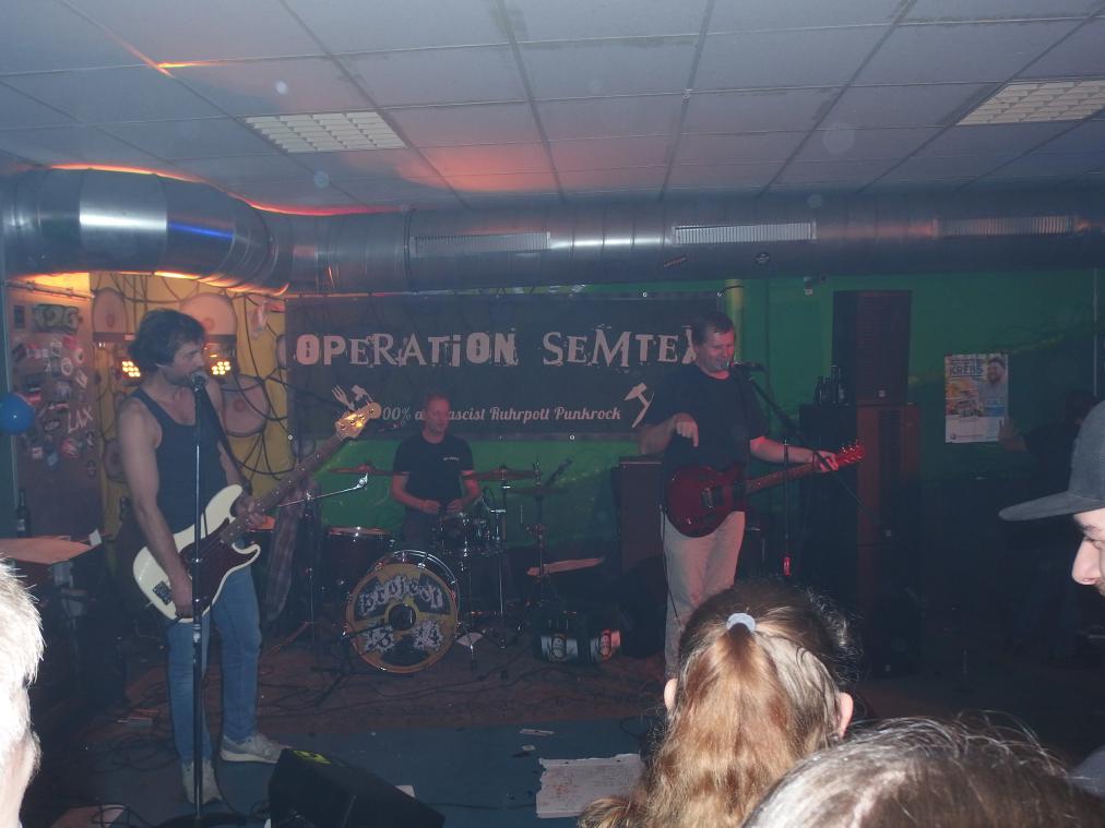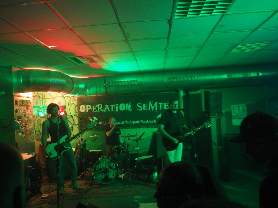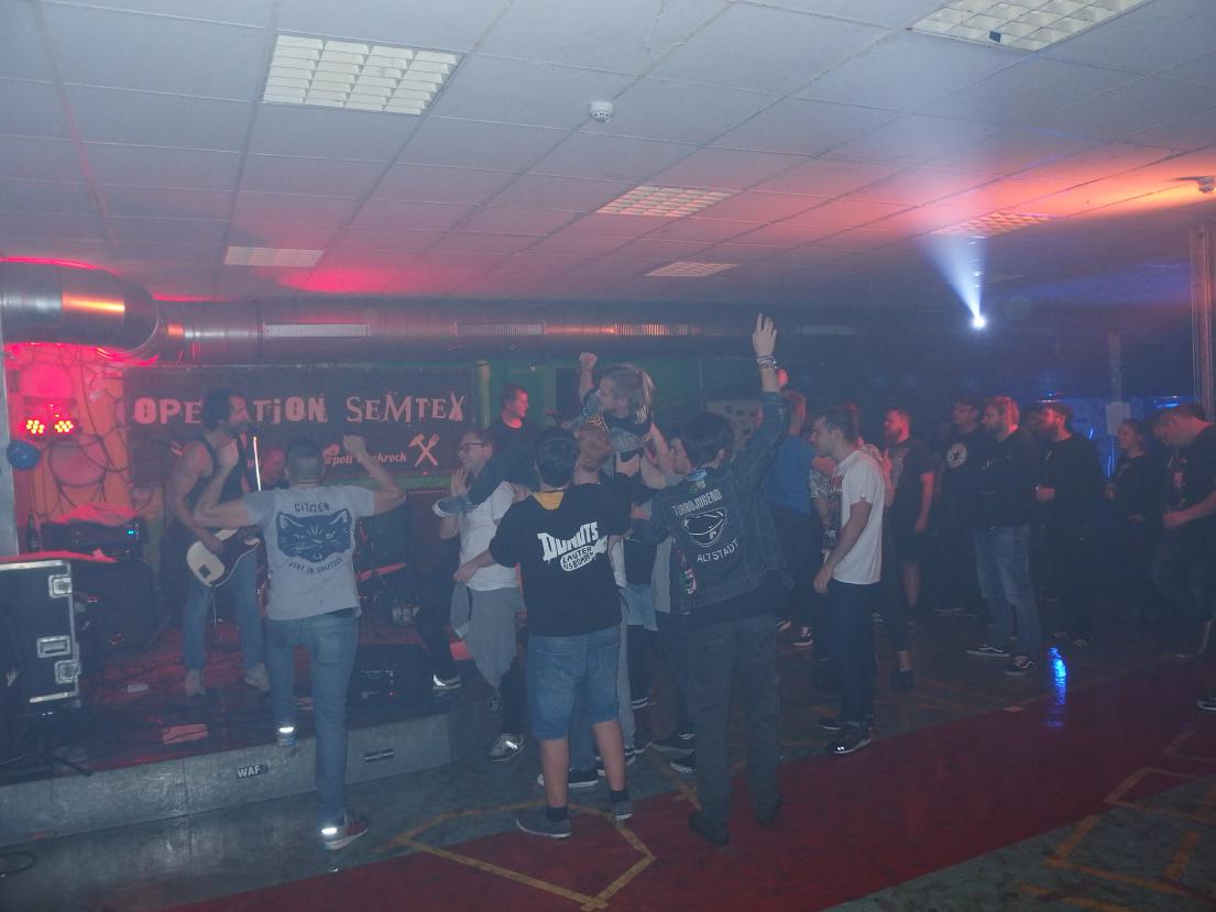 Aus irgendeinem Grund hatte ich Operation Semtex immer für eine Grauzonenband gehalten. Nun, falscher hätte ich damit wohl nicht liegen können, machte doch schon der Backdrop klar, dass es sich dabei um eine 100% antifaschistische Band aus dem Ruhrpott handelt. Musikalisch dachte ich am Anfang, dass sie zwar deutlich besser waren, als die Band davor (was nicht so schwer war), aber auch nicht wirklich erste Sahne. Aber da irrte ich mich, denn im Verlaufe des Gigs wurden die Songs immer besser. Vielleicht brauchten sie einfach ein paar Songs, um zueinander zu finden. Die späteren Tracks waren auf jeden Fall besser und haben mich ziemlich überzeugt. Langsam begann auch die Stimmung besser zu werden. Als Anheizer ziemlich cool.