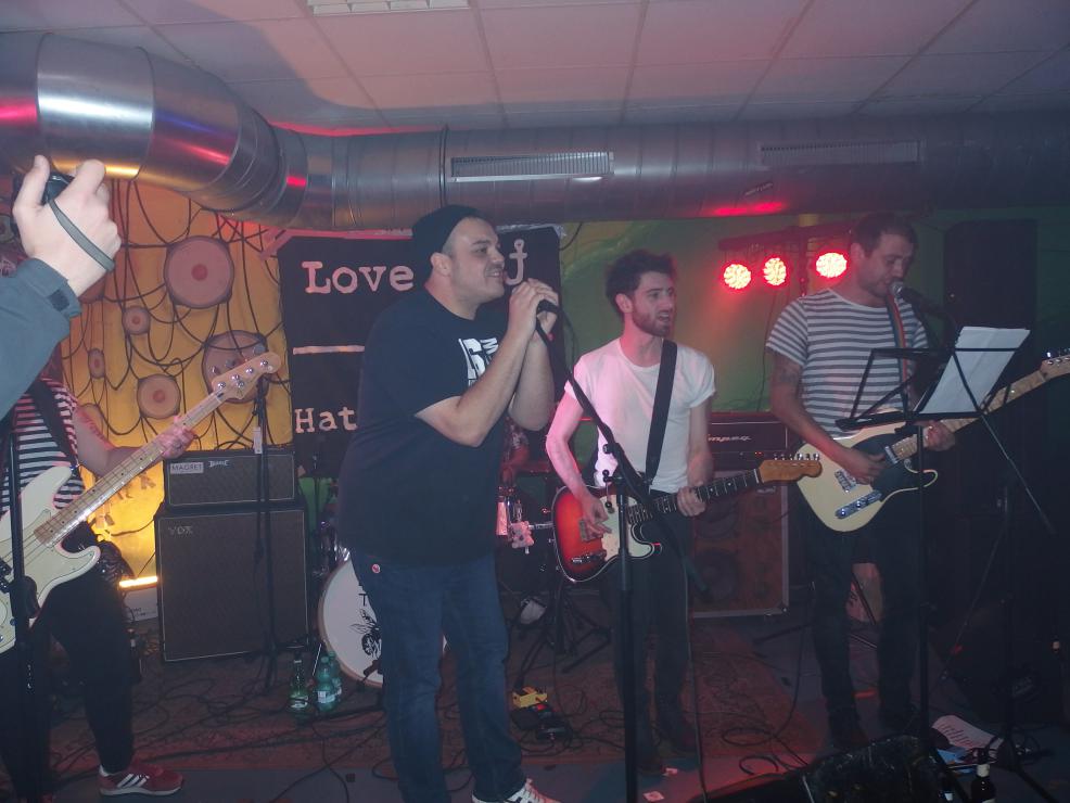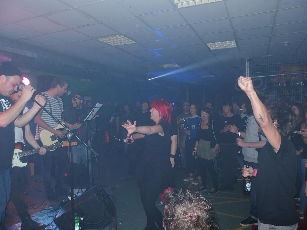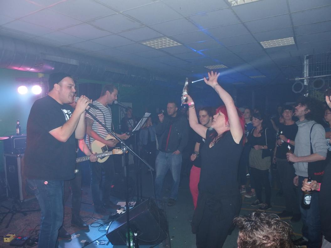 Mr. Inman hatten danach ein Problem, ein schönes zwar, aber nun mal ein Problem. Ihr Sänger wurde nämlich just an diesem Tag Vater. Doch den Gig absagen? Ist ja nicht Punkrock. In Windeseile wurde Fan Nummer 1 rekrutiert, der alle Texte auswendig kann. Dann teilten sich die anderen auch noch bei den restlichen Songs den Gesang. Etwas chaotischer Einstieg, der Soundman dachte, es wäre noch der Soundcheck. Kurz darauf betrat der Ersatzsänger die Bühen und man sollte es nicht glauben: Er machte seine Sache überraschend gut. Ich erinnere: bis vor wenigen Stunden wusste er noch gar nichts von seinem Glück. Da werden einige Patzer auch gerne übersehen. Ach ja, Bwegung gab es jetzt auch: etwas Gepoge und ein Rollstuhlfahrer (übrigens mit eigener Band: Muskelschwund, hört mal rein) wurde in einem Circle of Eight (oder so, halt in einer 8) geschoben und hatte sichtlich Spaß dran. Naja, dei 8 soll ja auch beruhigen habe ich gehört. Ansonsten wirklich ein sehr schöner Auftritt von Mr. Inman. An dieser Stelle noch mal Glückwunsch an den Namensgebenden Helden Mr. Inman zum Nachwuchs. Seine Inman-Kollegen haben jedenfalls alles gegeben, um ihn würdevoll zu vertreten. Vor kurzem ist eine Split-Single mit Dead Kätz erschienen, gibts aber wohl nur auf den Konzerten. Das Debütalbum von Mr. Inman allerdings (zumindest digital) auch über Amazon und natürlich Bandcamp. Wer auf nicht ganz blöden deutschsprachigen Punk (so Rachut,Turbstaat, vielleicht etwas schrammelige) steht, sollte mal reinhören. Lohnt sich!