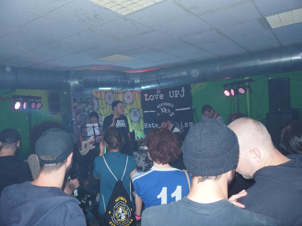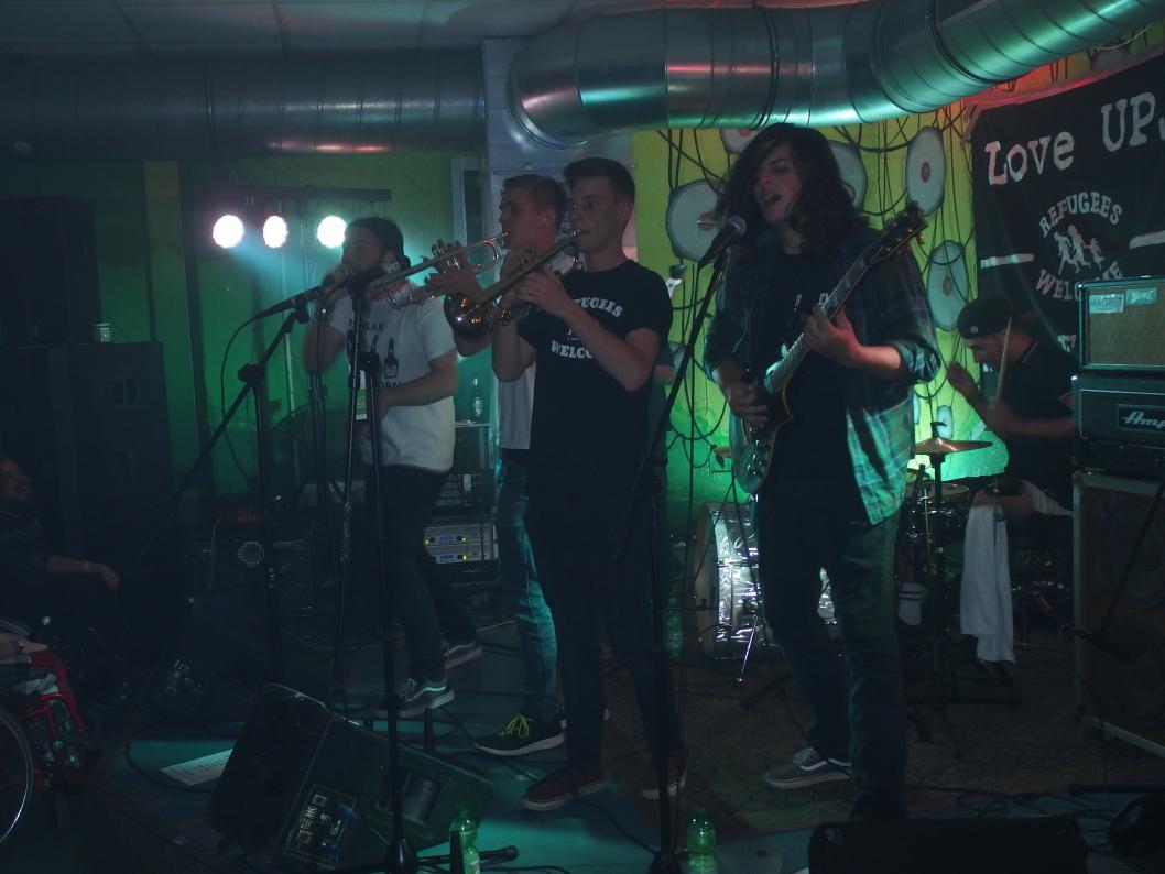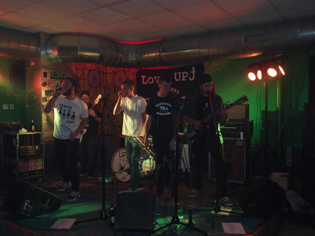 Zunächst waren UPJ dran. Die Urpilsjugend, die quasi gemäß Bandnamen schon eine Verbindung zu Knochenfabrik hat. Musikalisch eher nicht so, denn Trumpetpunkcore ist glaube ich nix, was dem Claus gefällt. Muss es ja auch nicht. Als Anheizer machten sich die von einer Coverband zur Kapelle mit eigenem Stil gereiften Nachwuchsband aus Limbach jedoch sehr gut. Sie präsentierten mehrere Songs ihrer 2017 erschienen EP. Ska mit Core zu vermischen gab es ja bereits häufiger, doch mit Skacore hat es dann auch nix zu tun. Jedenfalls sind die Trompeten nun häufiger im Vordergrund (was man auch schon an der gleichberechtigten Bühnenaufteilung sieht), aber es gibt einige Breaks und ab und an sogar Growling zu hören. interessante Mischung jedenfalls. Ganz auf Coverversionen wollte die Band nicht verzichten. Toulousi von Pascow bekommt man nicht aller Tage in einer Ska-Version präsentiert. Dann natürlich auch der Dauerbrenner Rendezvous with Anus, was man als Turbojugendmitglieder natürlich gerne präsentiert. FICKK DE HITLA stand auf der Setlist, Refugees Welcome auf dem Backdrop, antifaschistisch, super! Alles richtig gemacht (bis auf diese komischen Metalcor-Parts, ach ja, die Jugend).