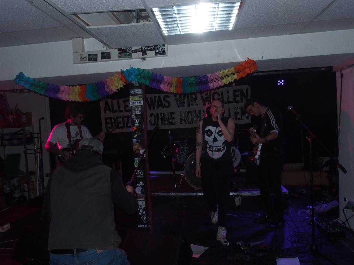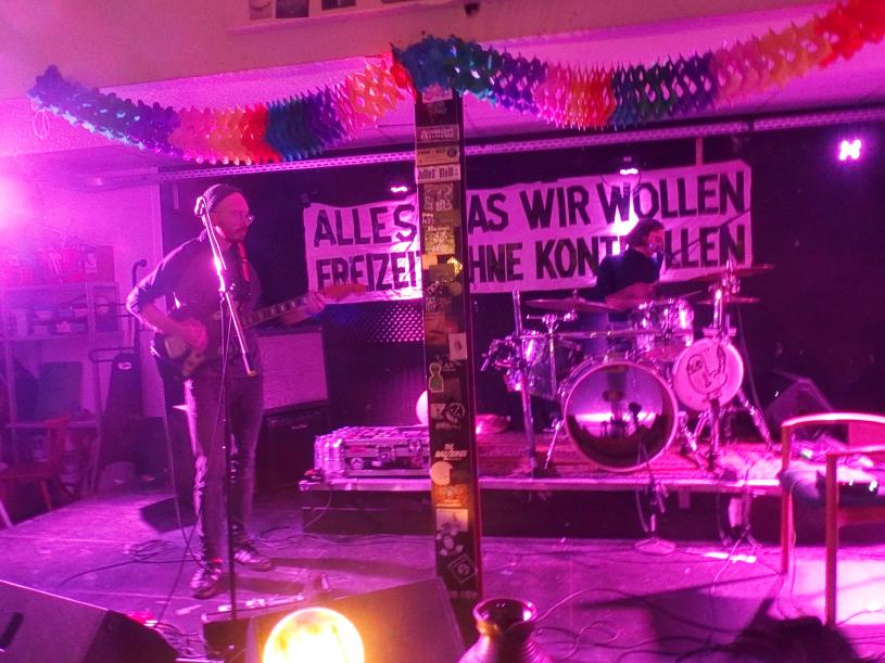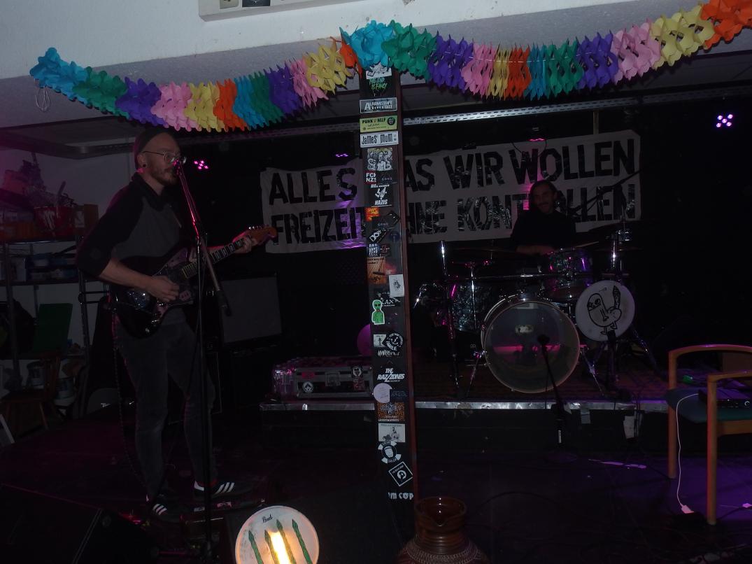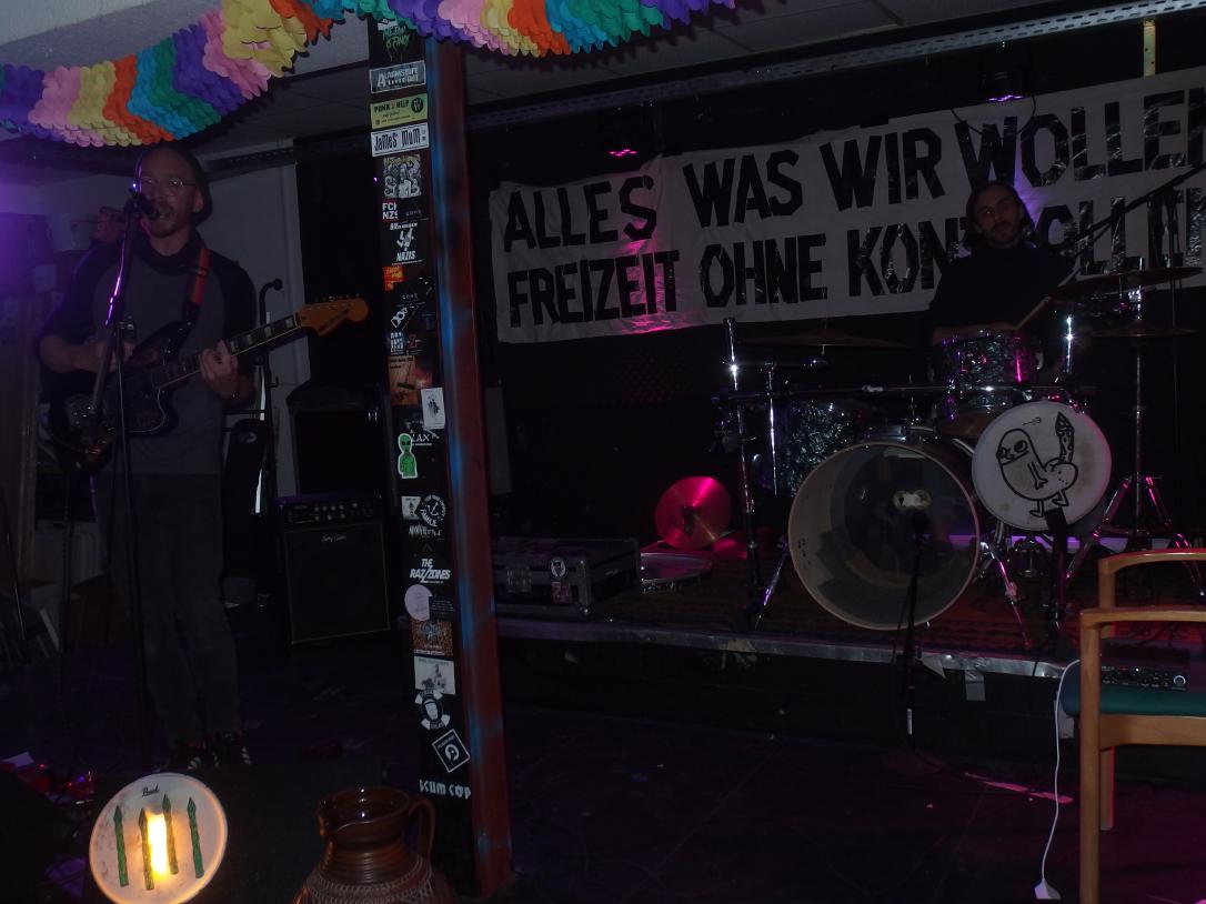 Musikalisch eröffneten Assparagus den Abend. Eine Two-Piece Garage/Surfpunk/Eggpunk Band aus der Südpfalz. Kannte ich bisher nicht. Gitarre udn Schlagzeug, minimalistischer Punk, auf den Punk gebracht. Bescheuertster Bandname und Maskottchen (ein Männchen, dem ein Spargel aus dem Arsch wächst), seltsames Merch (zwei Gläser Spargel). Buttons gabs gratis, aber wer will so was schon? Die Mucke war dafür allerdings recht gut. Probiert mal das Demo auf Bandcamp aus. Ist echt nicht schlecht.