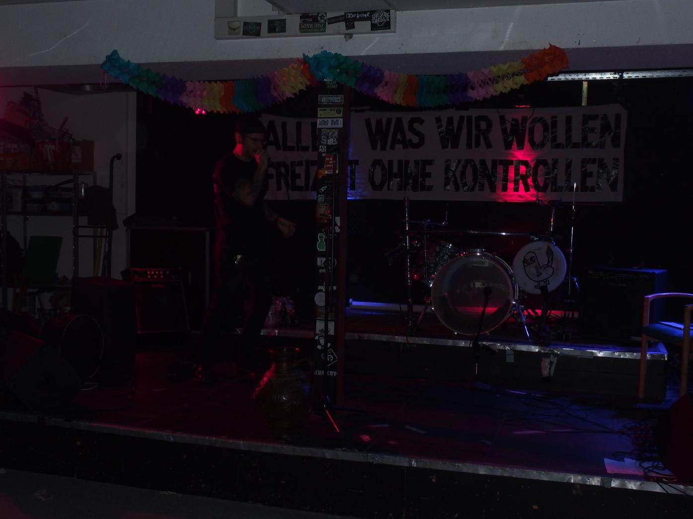 Philipp hab ich vorher getroffen, eine Mandoline führte er nicht mit sich, dafür einen Laptop. Und dann war es soweit. Der Laptop wurde angeschaltet und es war keine Playback-Show. Nein, Philipp hatte sich die Zeit genommen, die alten Pony Farm-Stücke und andere Songs aus jener Zeit und später elektronisch umzuarrangieren. Ein absolut umwerfendes Ergebnis. Es ist fantastisch zu sehen, wie aktuell die Songs geblieben sind und wie es gar nicht auffällt, das diese Songs zum Teil älter als das Juz sind. Mit einer Ausnahme, aber dazu später mehr. Jedenfalls erschienen die alten Songs im neuen Glanz und Philipp sang und tanzte dazu. Hatte fast was von den Sleaford Mods. Das Publikum kannte die Songs tatsächlich auch noch auswendig, was sich bei einem Song dann nicht so ganz gut machte. Die Jugendsünde von Pony Farm lautete Porno Queen. Das geht heute nimmer, weiß Philipp auch. Quasi ihr The Ballad of Chasey Lane-Moment. Den Song hatte er sogar mal selbst auf YouTube als frauenfeindlich gemeldet wer sich vom Text überzeugen möchte, nun ja, er hatte wohl keinen Erfolg damit. Jedenfalls hat er den text umarrangiert und einen Song über eine Feministin gemacht, die gegen das Patriarchat kämpft. Das funktioniert auf dem Papier ganz gut, aber wenn 50 Leute den alten Text noch auswendig kennen… Immerhin durfte er zwei Strophen dann in seiner neuen Version singen. Aber schon krass, das ist 20 Jahre her und da waren einfach Leute, die noch alle Texte kannten. Unfasslich… Von Dvnkel präsentierte er dann noch einen Song über einen verstorbenen Freund und dann noch einen Rausschmeißer. Ein sicherlich phänomenaler Auftritt.
