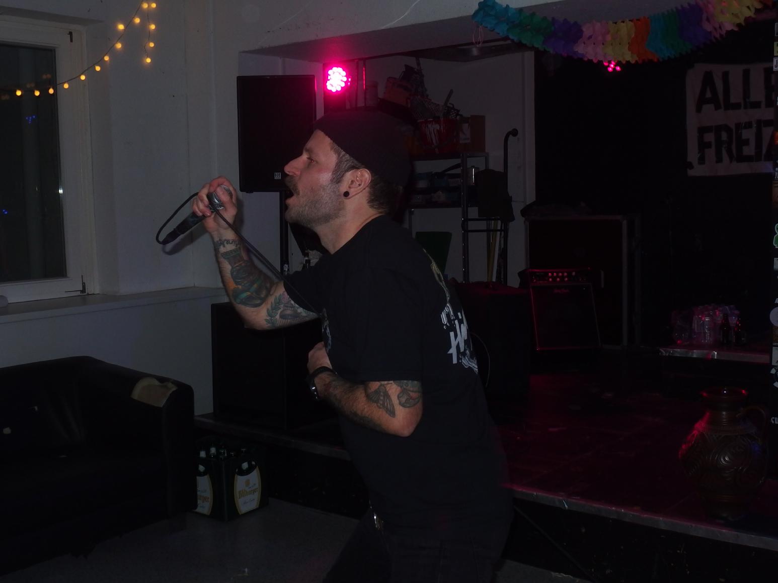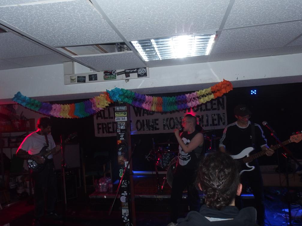 Die lokalen Helden von Upfluss machten danach ihre Aufwartung. Sie sind sehr stark mit dem Juz verbunden, hatten hier ihre ersten Auftritte und probten seit 2008 im „stählernen Kellerbunker“ (Zitat von Facebook), dem Proberaum des Juzes. Hatte sie dort auch schon mal gesehen. Teile der Texte (Le Cock de la Rue, Alexander heiszt Angriff) basieren auf Gestalten der damaligen Juz-Szene, Lieder wie Stadtfest und Ostsaarzorn sind wohl ohne das damalige Umfeld gar nicht möglich. Wie immer kamen die Ansagen vom Band. Ansonsten kannten die zahlreichen Gäste die Mucke natürlich genau und konnten auch die Texte mitgröhlen. Zum Abschluss gabs den Klassiker Kommentarspalte und natürlich Die Waff. Ein sehr schöner Auftritt der Neinkeijer Urgesteine.