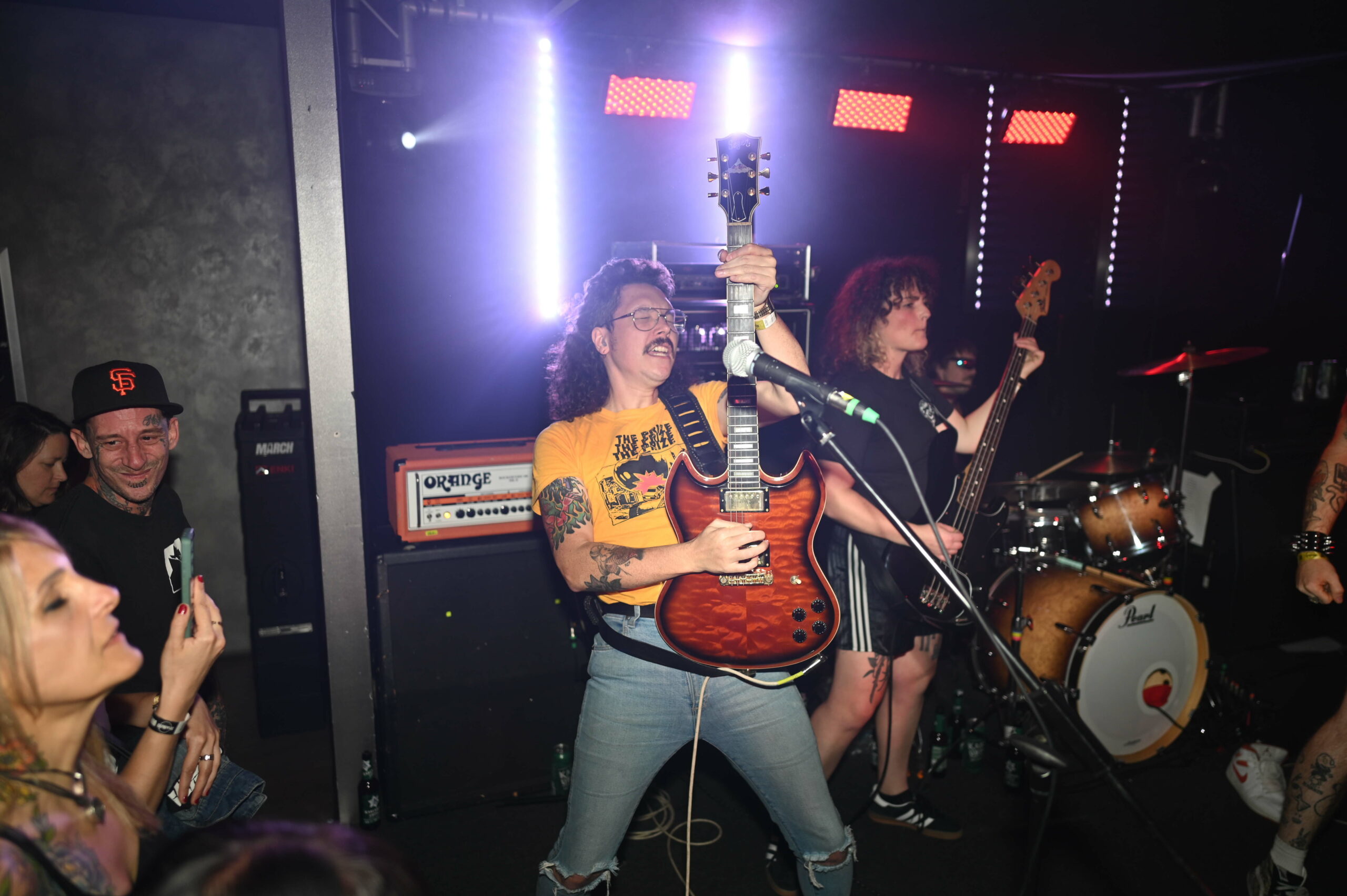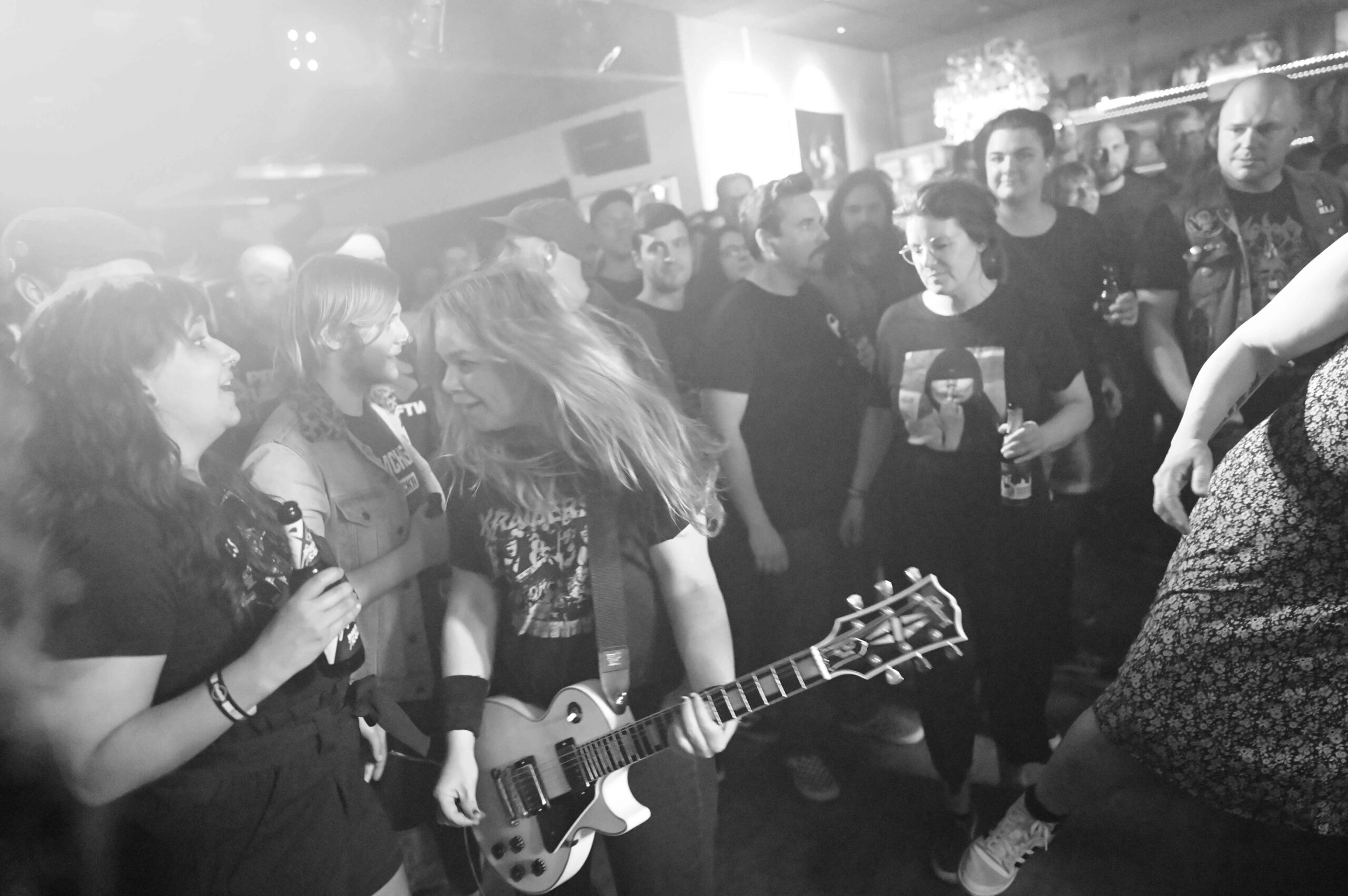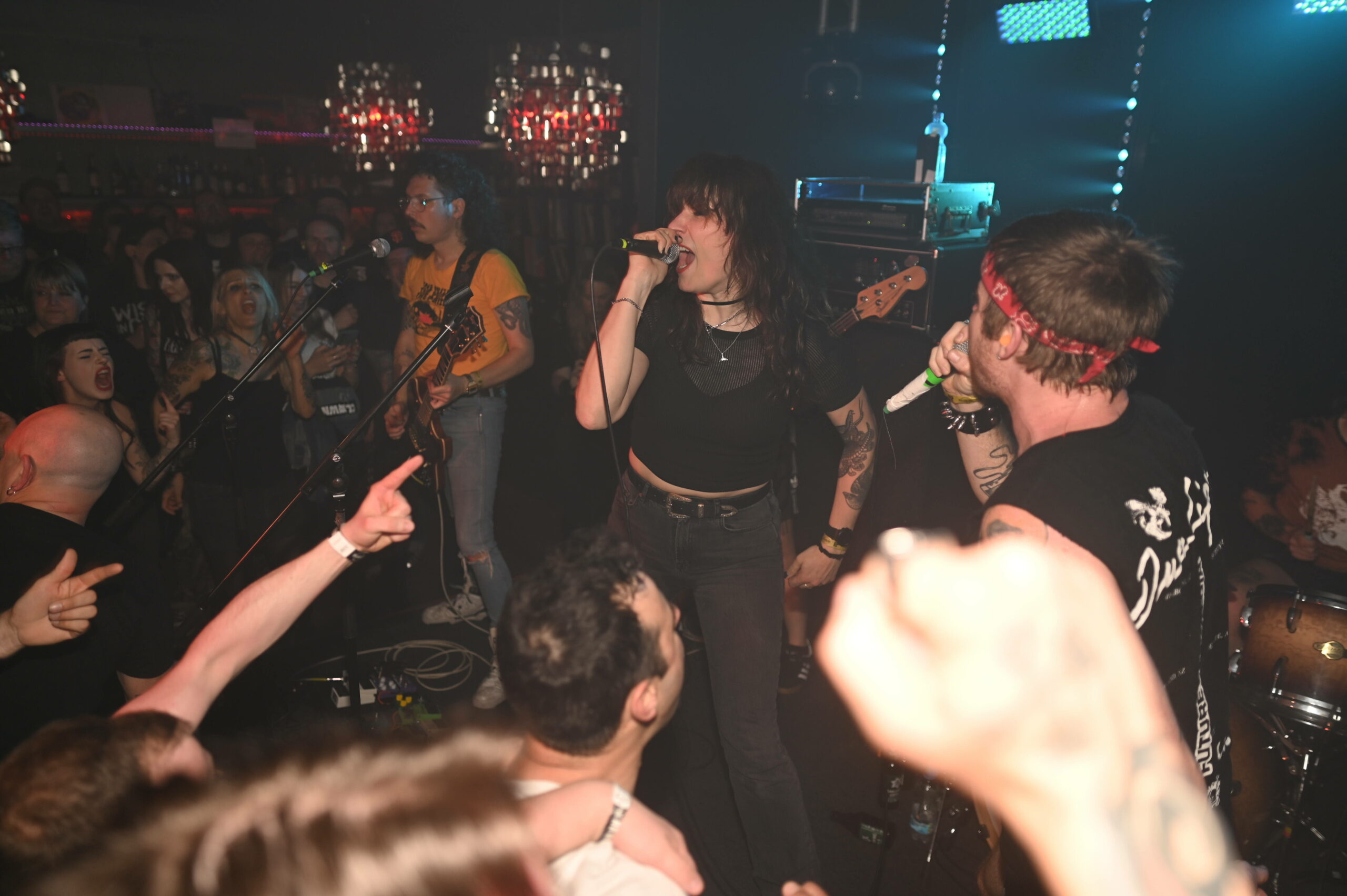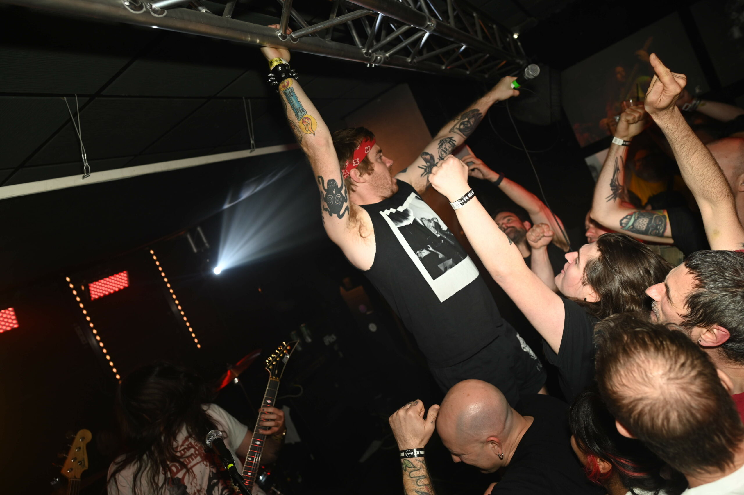 Wer Clowns schon mal live gesehen hat, weiß, was man erwarten kann, nämlich eine energiegeladen Show. Mir fiel aber sofort auf, dass was anders war als sonst. Hanni, die Bassistin, war nicht dabei. Ich wusste nicht, ob die Bassistin, die jetzt da war, ne Neue war, oder eben nur eine Ersatzbassistin. Warum Hanni nicht da war, erfuhr ich später und das ist echt nicht so schön. Leider hat sie aktuell Suchtprobleme, die sie in den Griff bekommen muss. Ich drücke ihr fest die Daumen, dass das klappt, denn auch wenn die andere gut war, hat Hanni irgendwie gefehlt. Die Frau hat nämlich eine krasse Bühnenpräsenz. Aber die Gesundheit geht halt vor. Stevie gibt aber mal wieder alles. Der steht in den Leuten, liegt auf den Leuten und liefert nur ab. Der Saunaclub hat sich dann auch temperaturmäßig irgendwann zum neunten Kreis der Hölle verwandelt. Als die Band dann I got a knife spielt, kommt Fleur, die Sängerin von March nochmal auf die Bühne und übernimmt den Part, den normalerweise Cecilia Boström von The Baboon Show singt. Und tatsächlich gefällt es mir so nochmal besser. Zusammen shouten Stevie und Fleur dann noch Enough`s Enough. Wow!! Fleur ohne Gitarre und so am shouten, die Frau sollte neben March noch eine Hardcore-Band gründen. Die Stimme und die Energie dazu hat sie definitiv. Ich bin schwer beeindruckt. Fleur verabschiedet sich dann stagedivend. Zum Abschluss des Sets schmeißt Stevie seinen Mikrofonständer in die Crowd, wirft sich hinterher und dann ist echt all hell breaks loose. Stagediver und Crowdsurfer von allen Seiten. Herrlich!