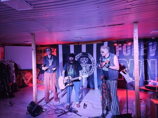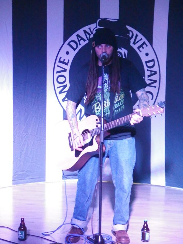 Dan Ganove die Bühne… na gut, den Boden vor dem Publikum, betrat. Der allerletzte Punk mit dem Schlafzimmerblick (Review hier) neigte dann auch direkt zu Kalauern und erheiterte die wenigen Gäste zunehmend mit Witzen über, naja, Tieren. Dan Ganove spielt Akustikpunk und war im DFG Café wohl schon mal mit Tex Brasket aufgetreten, den ich damals verpasst habe. Insofern kannte er auch schon ein paar aus dem Publikum. Seinen doch etwas niveaulosen Humor muss man mögen. Leider ergriff Redaktionskollege Steve dann doch die Flucht… Dabei fings mit Heute hier, morgen dort recht gut an. Bin ja ein alter Wader-Fan- Man muss aber auch sagen, es ist schon hart, wenn der Ganove von Witzen über Sodomie plötzlich ein andächtiges Lied über seine tote Mutter singt. Aber das Lied war auch wirklich, wirklich berührend. Leider ist mir der Titel entfallen. Es handelt von einer Nahtod-Erfahrung seiner damals noch lebenden Mutter, die bei einem Autounfall dachte, sie käme in den Himmel und dort würde The Clash laufen. Dies nahm Dan Ganove zum Anlass nch ihrem Tod diesen Song zu schreiben. Boah, das war schon Gänsehaut… Danach wurde es aber wieder zotig. Diese Gratwanderung macht es durchaus etwas schwer, aber für mich hat er sich da so ein bisschen in mein Herz gespielt, irgendwie.