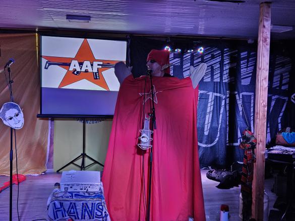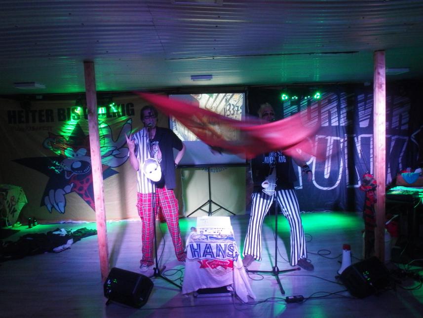 Nach einer kurzen Pause gings dann auch schon mit dem Kabarett-Programm los. Da ich Shazam an hatte, hab ich auch fast die komplette Playlist, denn ja, es war natürlich eine ziemliche Karaoke-Show mit Halbplayback. Aber sehr, sehr unterhaltsam. Marco und Micha präsentierten Songs aus 100 Jahre HbW Äh quatsch, also ja, natürlich aus dem Album auch, Alptraummelodie nämlich. Aber ich meinte natürlich aus ihrer gesamten Schaffensperiode. Und so entdeckte ich auch F**k dich!! wieder, der auf der Deutschen Punkinvasion II war. Auch neue Songs, wie Pegidamann, den sie zusammen mit dem Wahren Heino aufgenommen haben, spielten sieUnd Klassiker, wie das geniale Klaus der Geiger-Cover Nein, Nein (Wir wollen nicht eure Welt). Um das leibliche Wohl der Gäste bemüht gabs auch noch Freibier in Dosenform für alle. Der sehr spezielle Humor von Heiter bis wolkig kann zotig sein. Zum Beispiel das Kasperle…