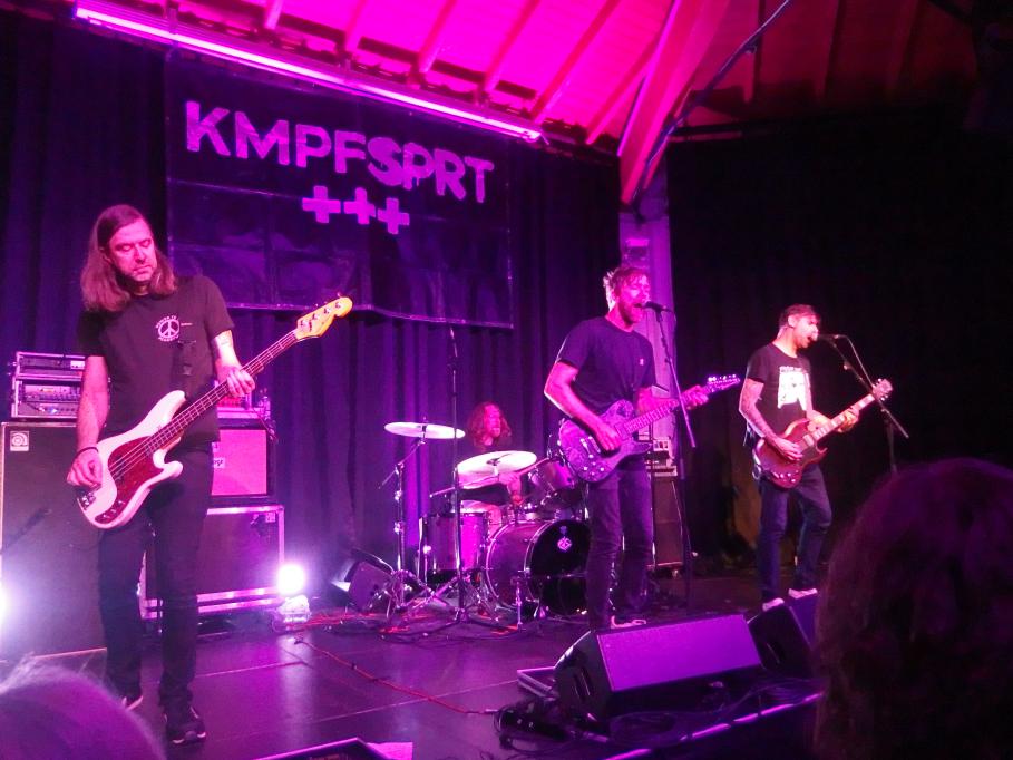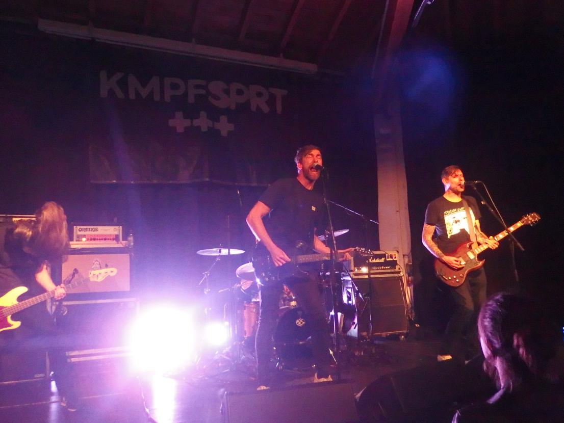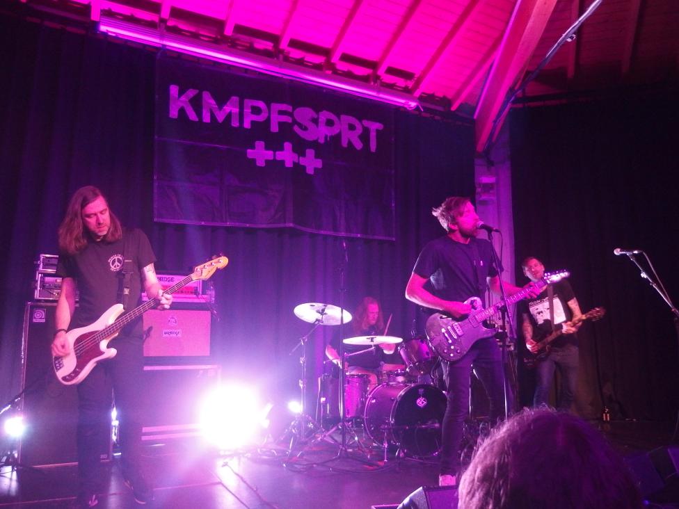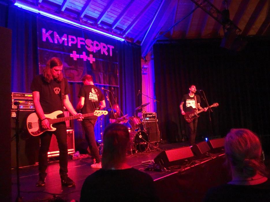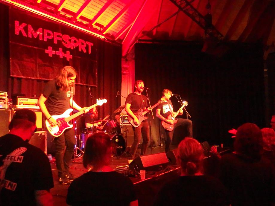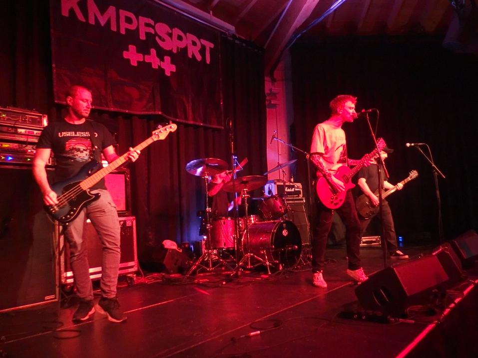 b) Snareset aus Münster noch nie im Saarland waren. Aber gut, ich kannte die Vorband nicht. Und wusste auch nicht, ob sie nun Snare-set oder Sna-Reset heißen. Da sie ihren eigenen Bandnamen auf der Bühne wegnuschelten, erfuhr ich erst beim KMPFSPRT-Set, das Variante 1 richtig ist. Mittlerweile 15 Jahre alt und ein Album auf Uncle M (With a Spark, 2019) war es ein routinierter Auftritt der Münsteraner Punkrockband mit eingängigen Songs. Es gab auch etwas mehr als Achtungsapplaus, auch wenn die um die 60 Besucher natürlich auf KMPFPRT warteten.