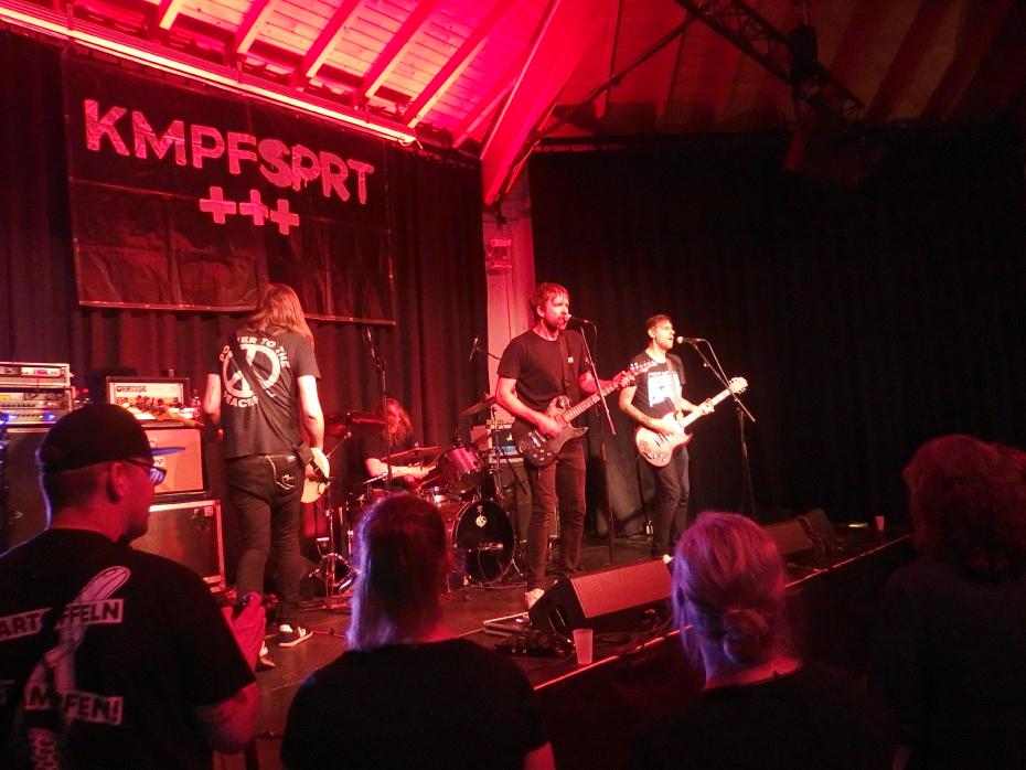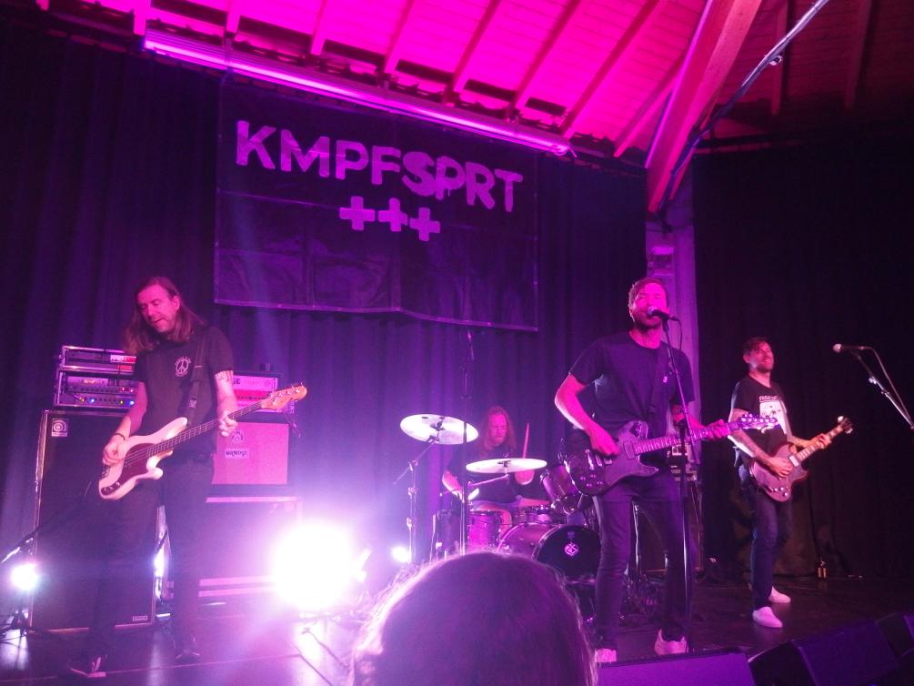 KMPFSPRT waren bekanntermaßen Aus gegebenen Anlass (Review) hier und dementsprechend präsentierten sie auch viele Songs aus dem aktuellen Album, das für mich ein starker Anwärter auf den Titel Album des Jahres ist. Aus gegebenem Anlass heißt aber auch, das man hier ist wegen der Erstarken der Rechten und dem etwas entgegensetzen will. Und das taten sie mit Songs wie Das Ende aller Tage, das gleich zu Anfang (dritter Song) klarstellte, wo man politisch steht. Das setzte sich natürlich fort mit anderen Gassenhauern Antithese und Musikdienstverweigerer (darüber, das man nicht die gleichen Fans wie die Onkelz will). Natürlich kam auch die Ehrenfeld-7“ zu Ehren. Drei Stücke der Hardcore-Platte gab es, wobei das Stück Ich fahr schwarz auf die „Saa-Ar-Bahn“ statt KVB umgemünzt wurde. Das Publikum hat wohl zu spät reagiert, denn die NVG (Neunkircher VerkehrsGesellschaft) hätte natürlich besser in den Text reingepasst.