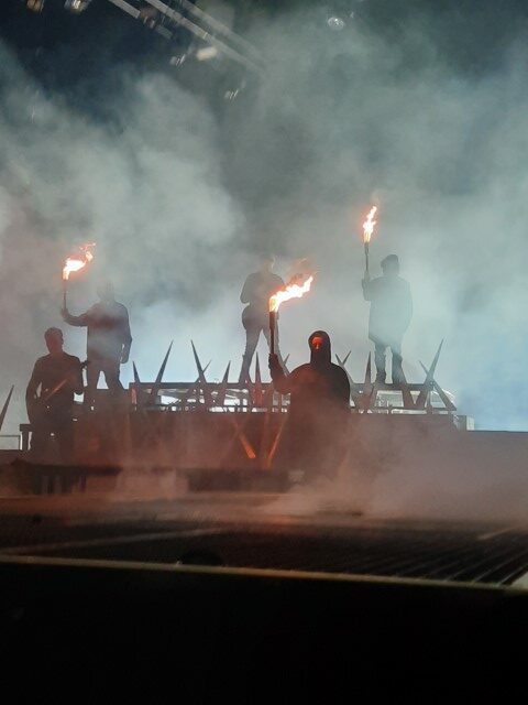 Dann wurde es finster, unheimlich und feurig. Als ich Parkway Drive das letzte Mal gesehen habe, spielten sie noch im Zenith, also von halber Kulisse quasi. Seitdem hat sich um Vocalist Winston McCall sehr viel getan. Nicht nur, dass sich der Stil immer mehr vom Core zum Metal gewandelt hat. Nein, die Herren sind auch mittlerweile richtige Stars. Und das hat auch die Show gezeigt. Dunkelheit, Nebelschwaden und unheimliche Videosequenzen haben das Ganze in dunkle Stille getaucht. In Mönchskutten kamen dann Roadies mit brennenden Fackeln auf die Bühne. Hinterher dann die Band. Vorne am Ende des „Catwalk“ fuhr dann McCall aus der Tiefe empor und mit Flammen und einem lauten Knall (Ich hatte kurz einen Herzstillstand) begann das Spektakel.