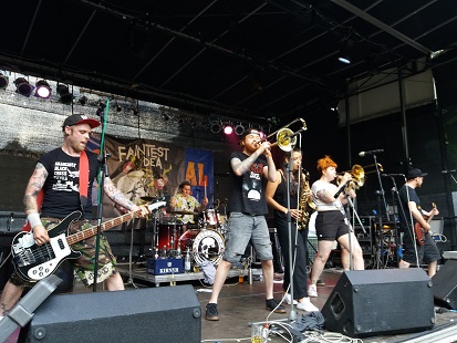 Dann packen die britischen FAINEST IDEA ihre Trompeten aus. Recht harter Skapunk wird geboten. Ist ganz nett, jedoch nicht so meine Musik. Jedoch füllt sich das Gelände und es wird getanzt! Inzwischen ist die Schnapsbar geöffnet!!!