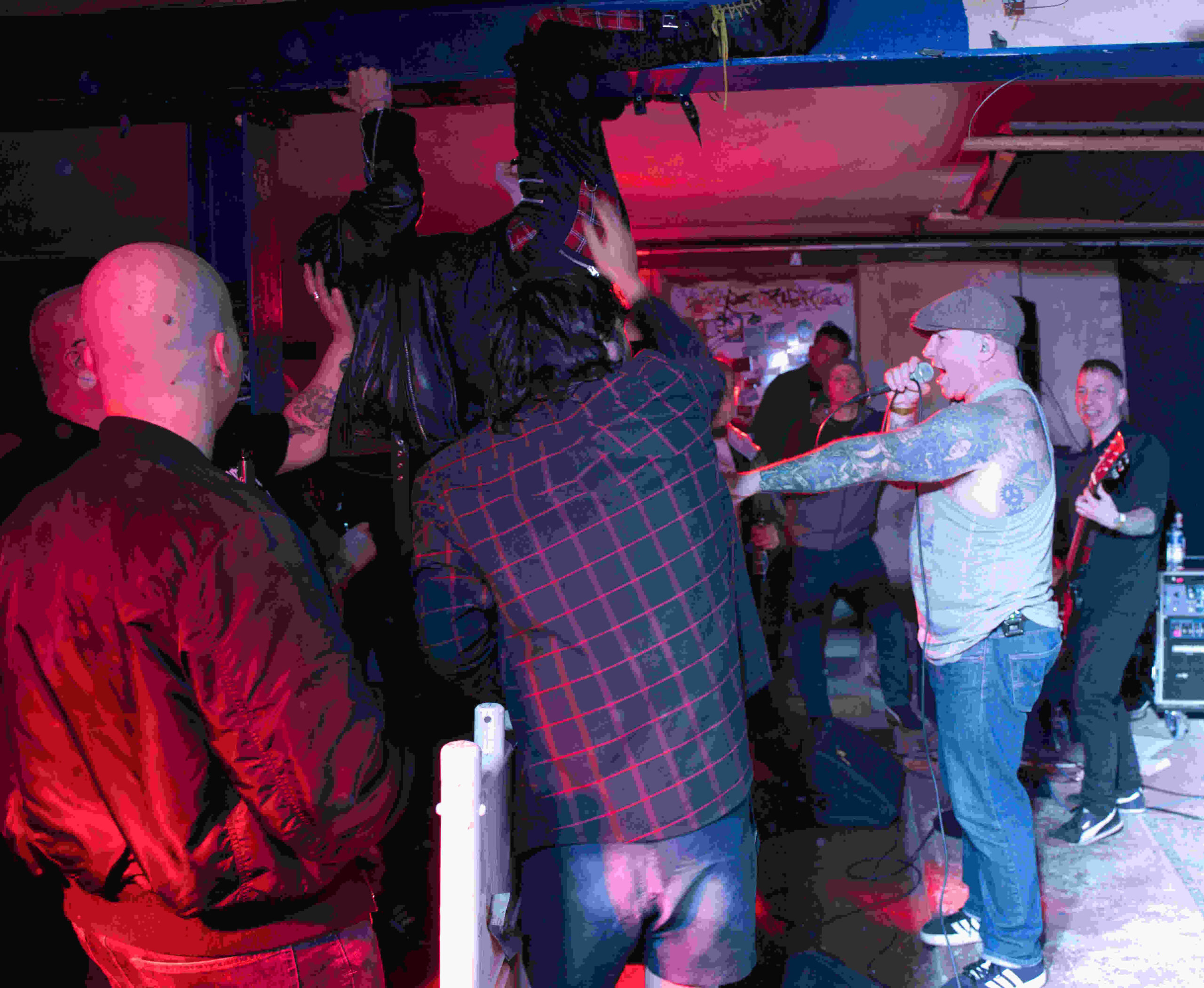Auf den Auftritt der Freiburger hatte ich mich besonders gefreut. Haben sie doch mit Niedrige Beweggründe für mich eins der besten deutschsprachigen Oi!-Alben jemals herausgebracht. Ein Album, das musikalisch extrem gut ist und teils seriöse Texte hat, aber auch Humor beweist, ohne primitiv zu wirken. (Ob sie das wohl gerne hören?) Ich war nicht der einzige, der diese Band unbedingt live sehen wollte. Das Erdgeschoss platzte fast aus allen Nähten und Nowitschok lieferten einfach nur ab! The Roadblocks hatten sich dann den Spaß erlaubt, das Bier gegen bleifreies Bier auszutauschen, was den Saufschweinen natürlich direkt auffiel. So ging es erst weiter, als wieder normaler Stoff am Start war. Als sie dann einen neuen Song spielten, wunderten sie sich, dass da keine Sau mitgesungen hatte. Sehr zu meiner Freude wurde noch What I Am von The Skinflicks gecovert, und weil noch Zeit war, spielten sie Wir werden mehr noch ein zweites Mal. Ein mehr als starker Auftritt, mit starker Musik und dem ein oder anderen lustigen Spruch, der das Publikum wild feiern ließ.