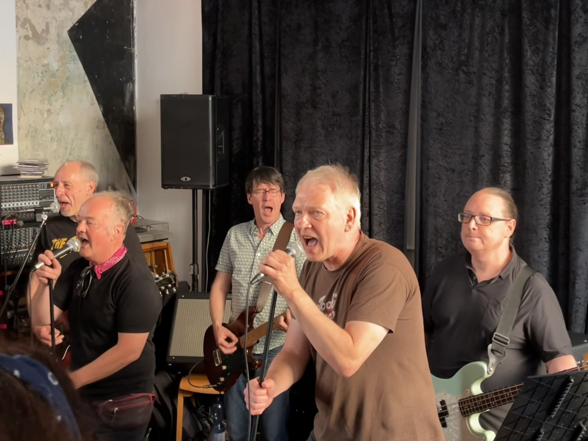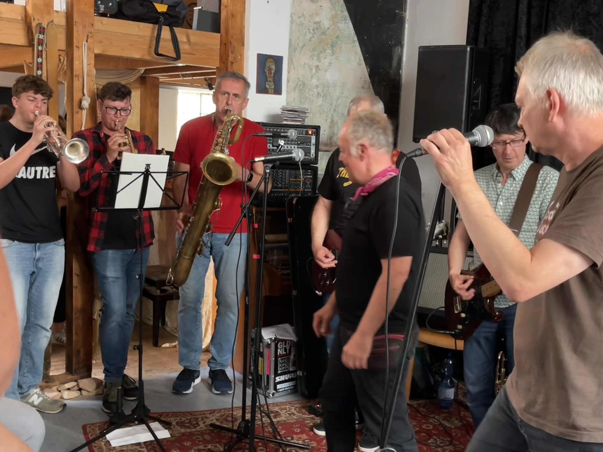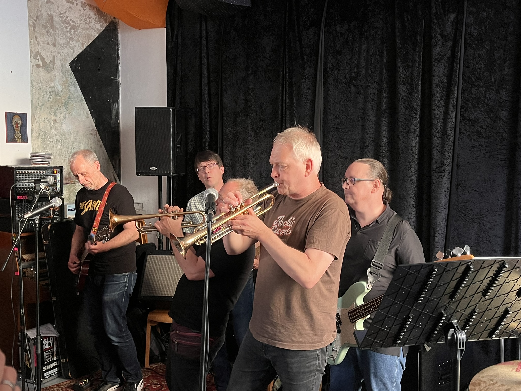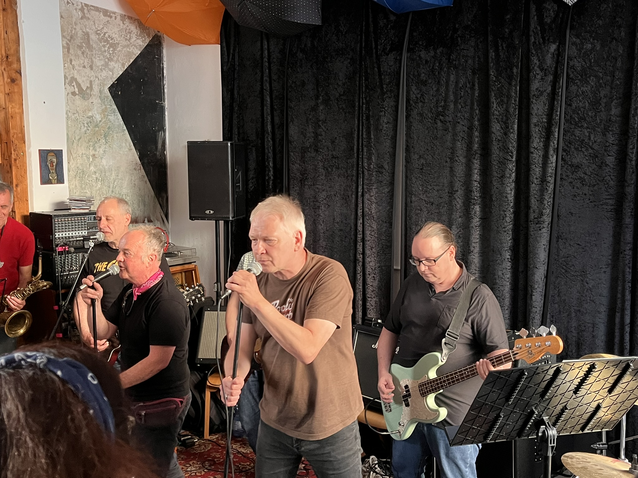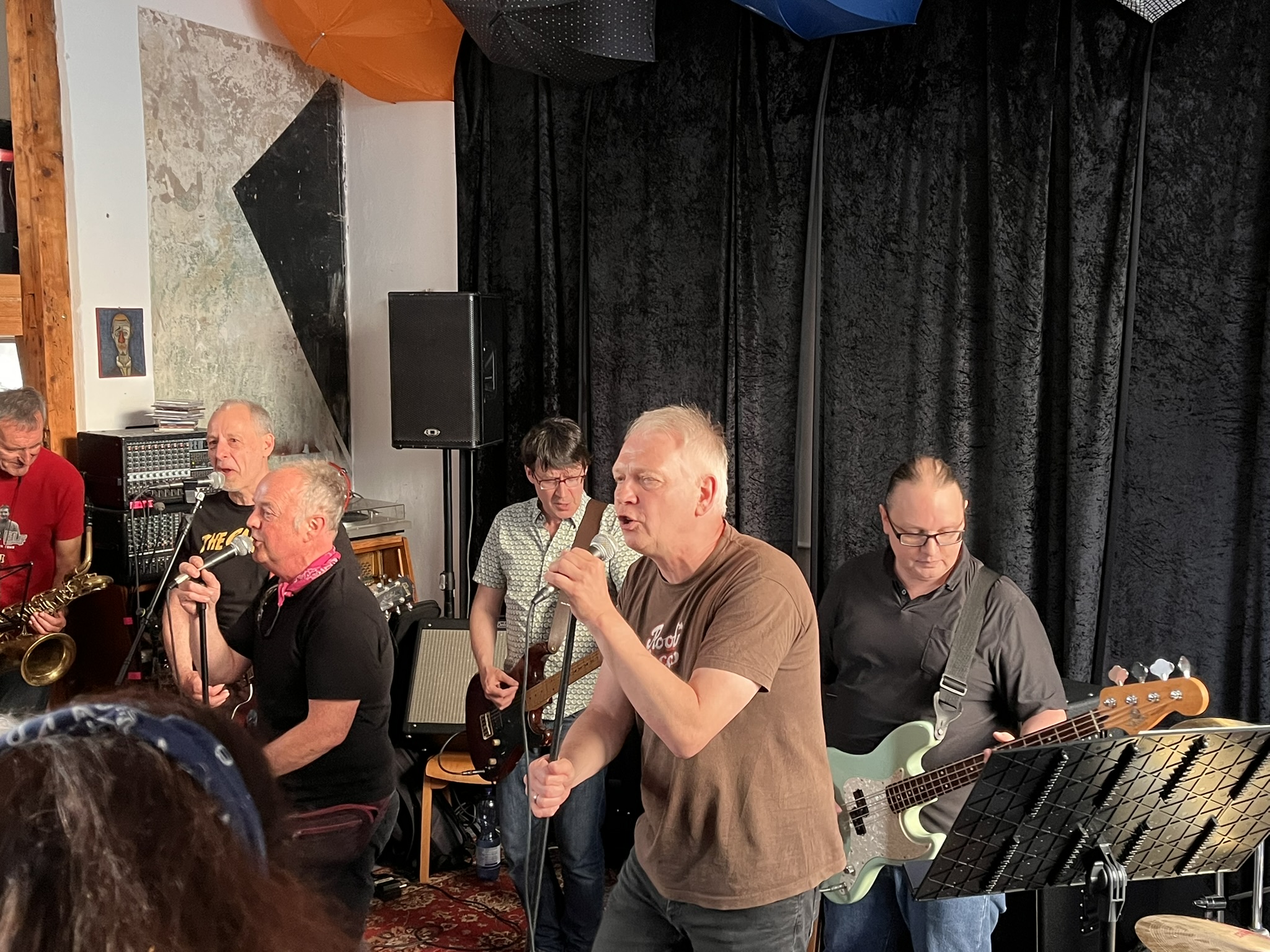 Anfänglich kommen erstmal vier Songs mit Bläsern. Hier gibt es Unterstützung: zwei Junge Trompeter dürfen mitspielen. Die Jungs kommen vom nahegelegenen Gymnasium welches Gitarrist Jürgen vor über 40 Jahren auch besucht hat. Nach Männer in Rot verabschiedet Sänger Beppo die beiden zum lernen fürs Abi. Tatsächlich haben die beiden Dienstags Abiturprüfungen!