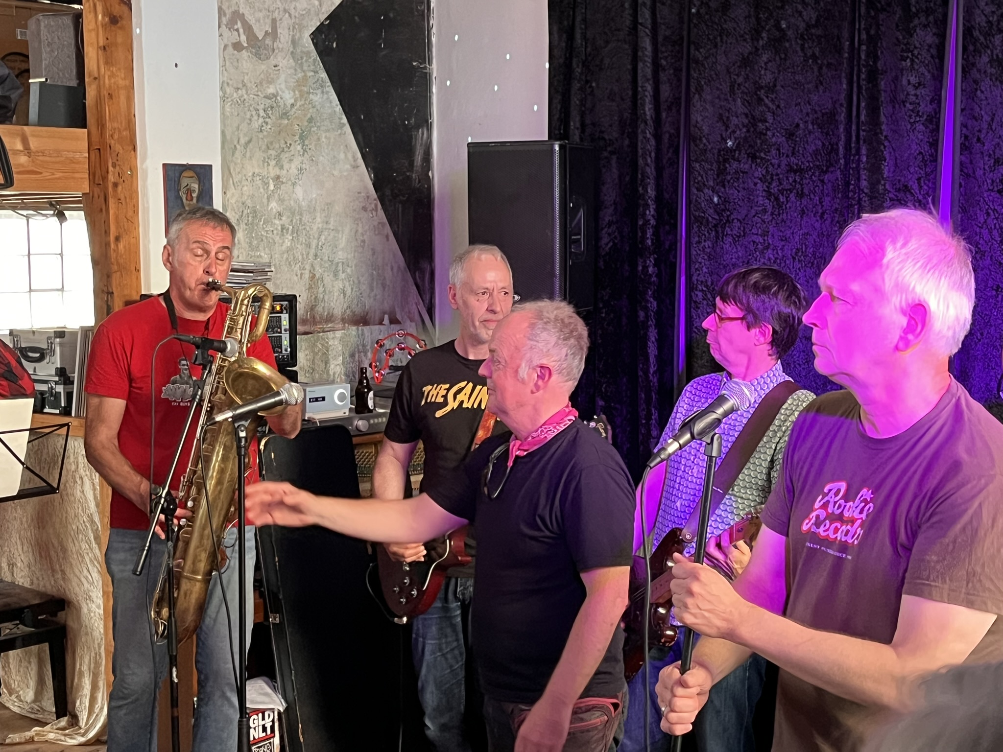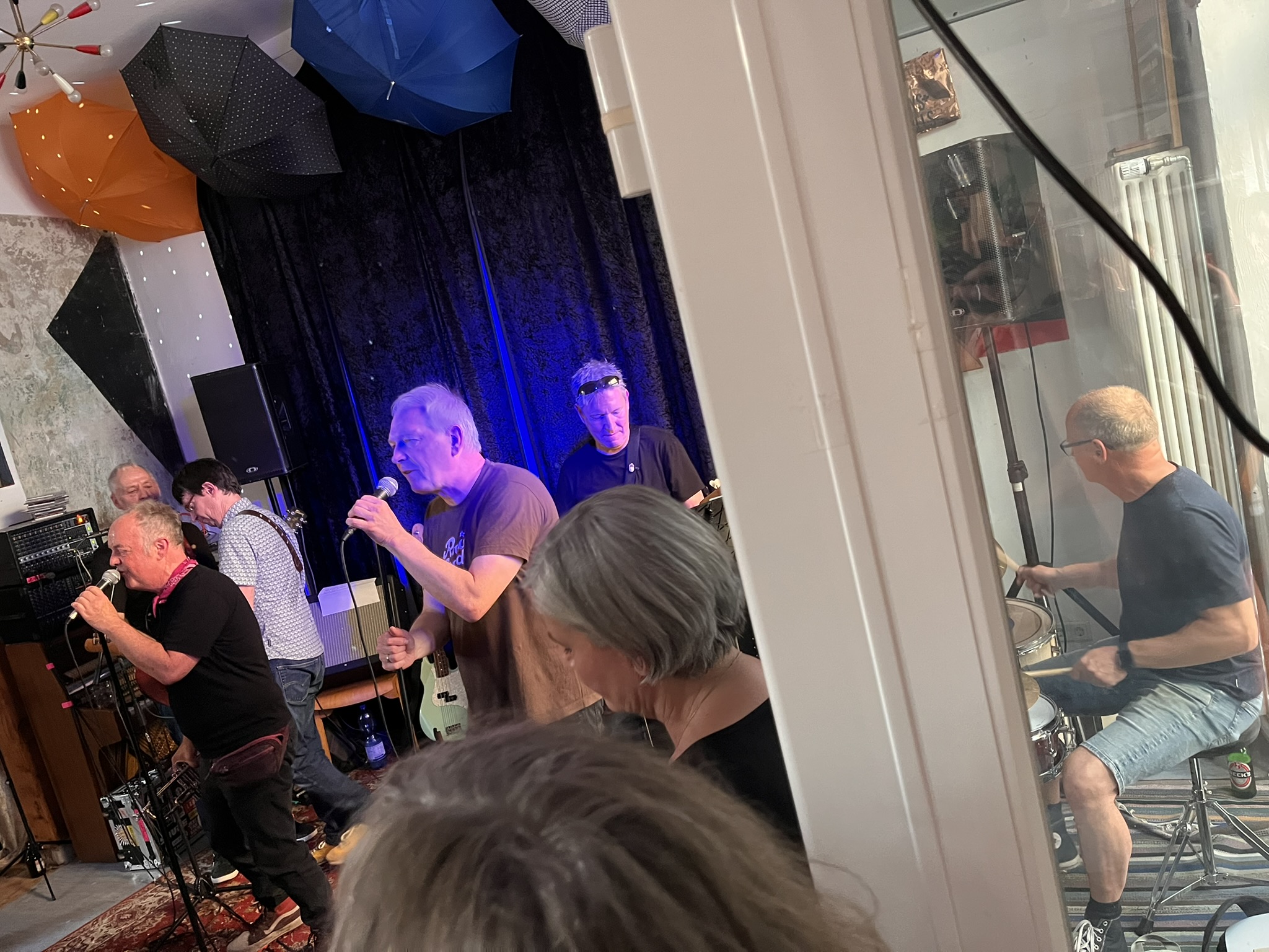 Anfänglich kommen erstmal vier Songs mit Bläsern. Hier gibt es Unterstützung: zwei Junge Trompeter dürfen mitspielen. Die Jungs kommen vom nahegelegenen Gymnasium welches Gitarrist Jürgen vor über 40 Jahren auch besucht hat. Nach Männer in Rot verabschiedet Sänger Beppo die beiden zum Lernen fürs Abi. Tatsächlich haben die beiden dienstags Abiturprüfungen!