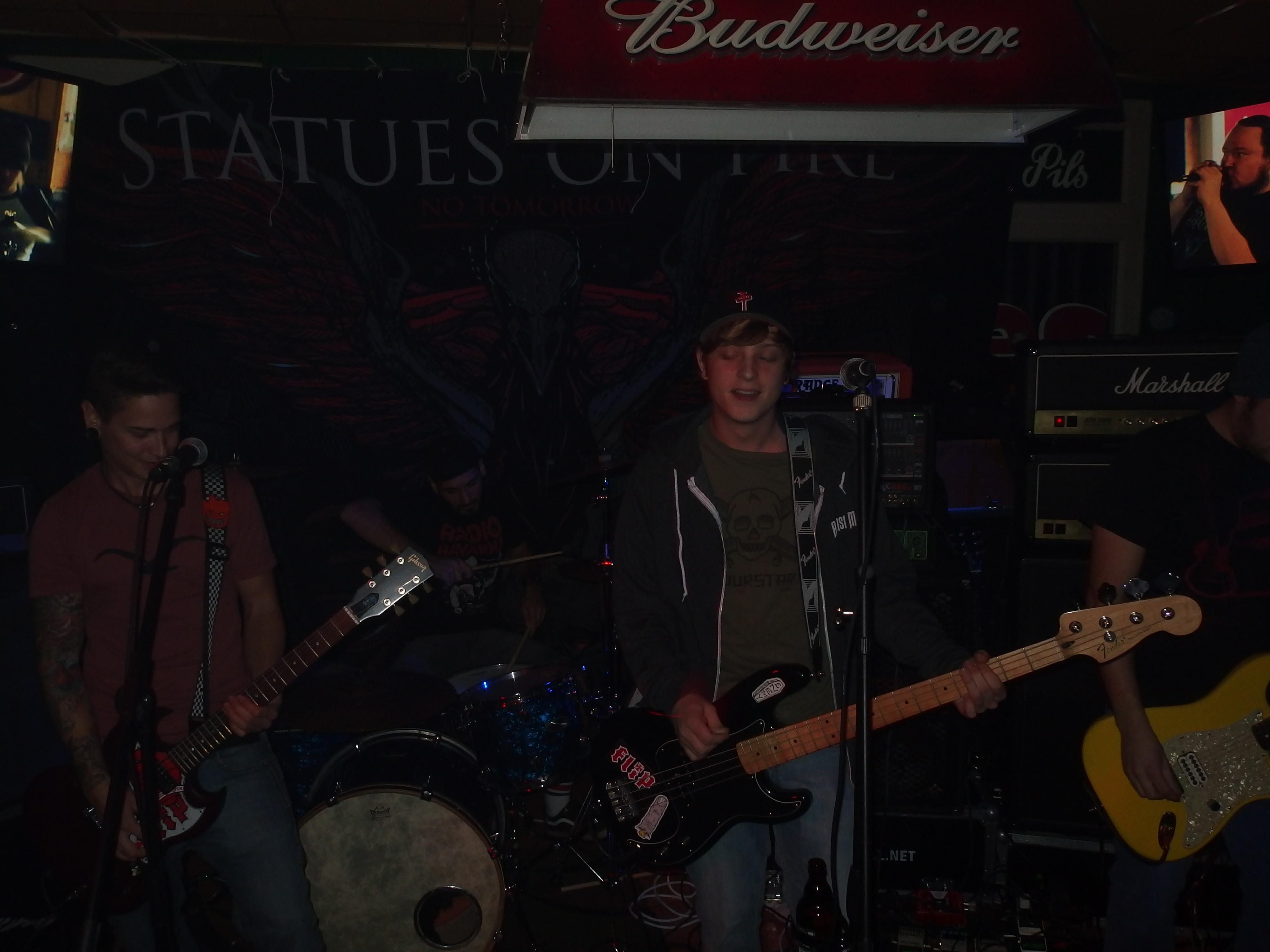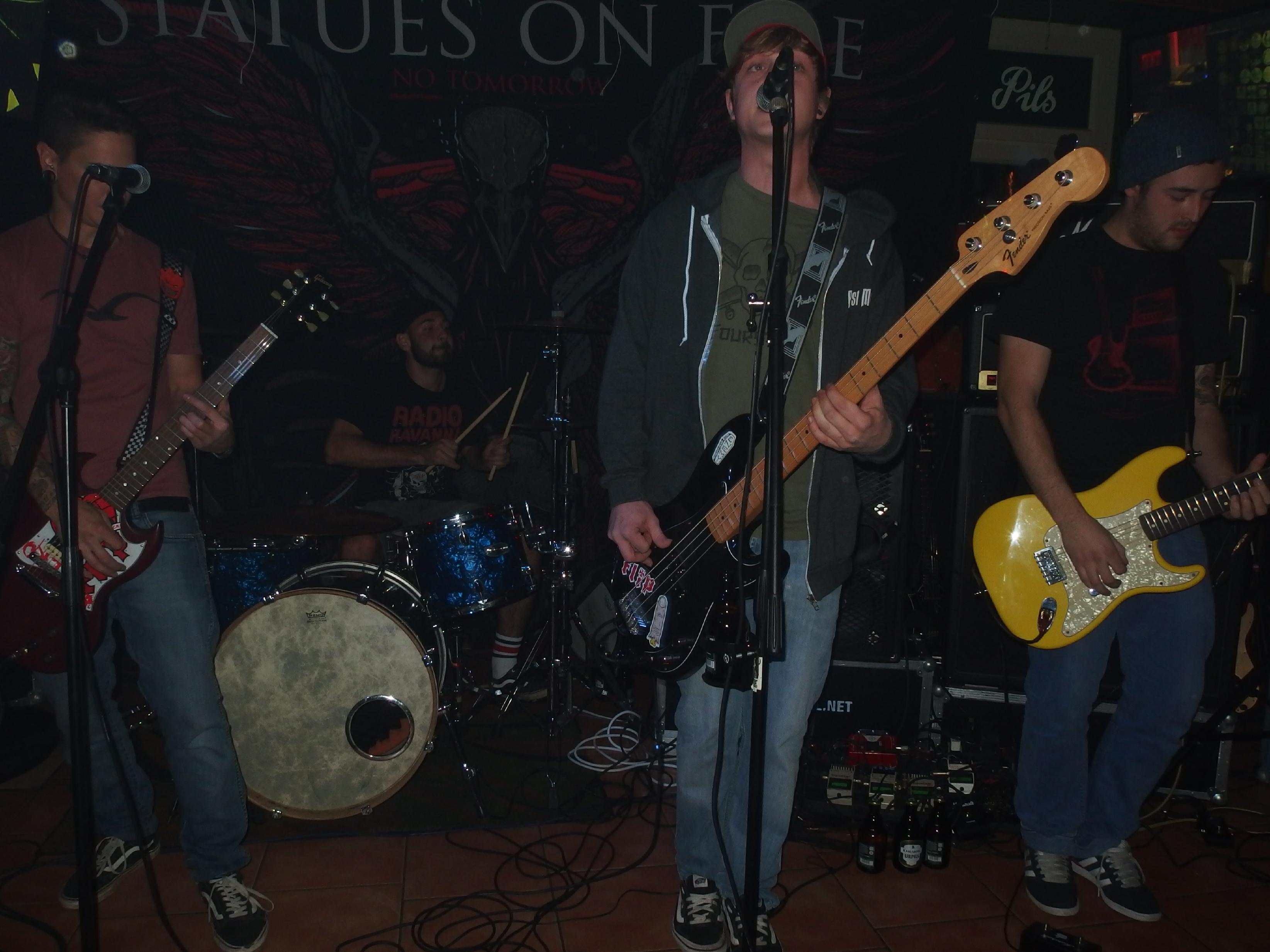 Statues on Fire hatten danach leichtes Spiel. War es doch nicht ihr erster Auftritt in der saarländischen hauptstadt und auch nicht ihr erster Auftritt im Nilles. Mit den doch sehr engen Begebenheiten gut klarkommend (Sorry, für mein Blitzlicht 😉 zeigte die Band in dem fast einstündigen Gig ihr komplettes Repertoire von ihren beiden über Rookie Records veröffentlichten Alben. Auf Platte mir etwas zu Melodycore-mäßig boten sie live anständigen Punkrock und sogar ab und an etwas metallischere Riffs. So erinnert beispielsweise Minority Ain’t No Longer Just a Few vom Riffing her dezent an frühe Metallica. Das Publikum liebte die Band ganz offensichtlich. Es wurde noch ein Stück enger und ab und an mussten Gitarren udn Bass an den Fans vorbei manövriert werden. Und das an einem Mittwoch Abend. Unfassbar. Eine kleine Crowdsurfing-Aktion mit dem Veranstalter gab es auch. Der Abend hat sich für die Band auch sichtlich gelohnt, denn als der Hut herumgereicht wurde, war doch ein Batzen Geld drin. Ich glaube mit offiziellem Eintritt wäre da nicht so viel bei rumgekommen. Nach dem offiziellen Setende gab es noch drei Zugaben, bevor die Kneipe ihren Normalbetrieb wieder aufnahm.