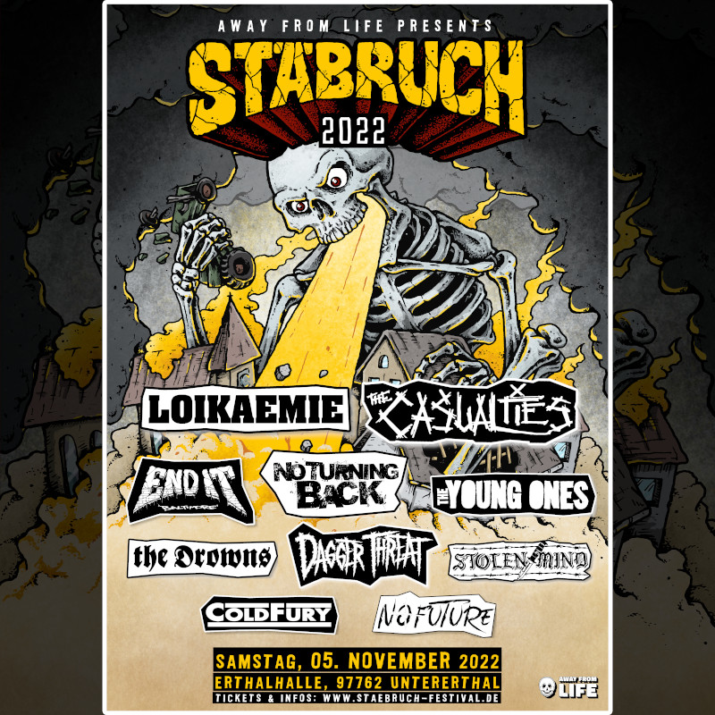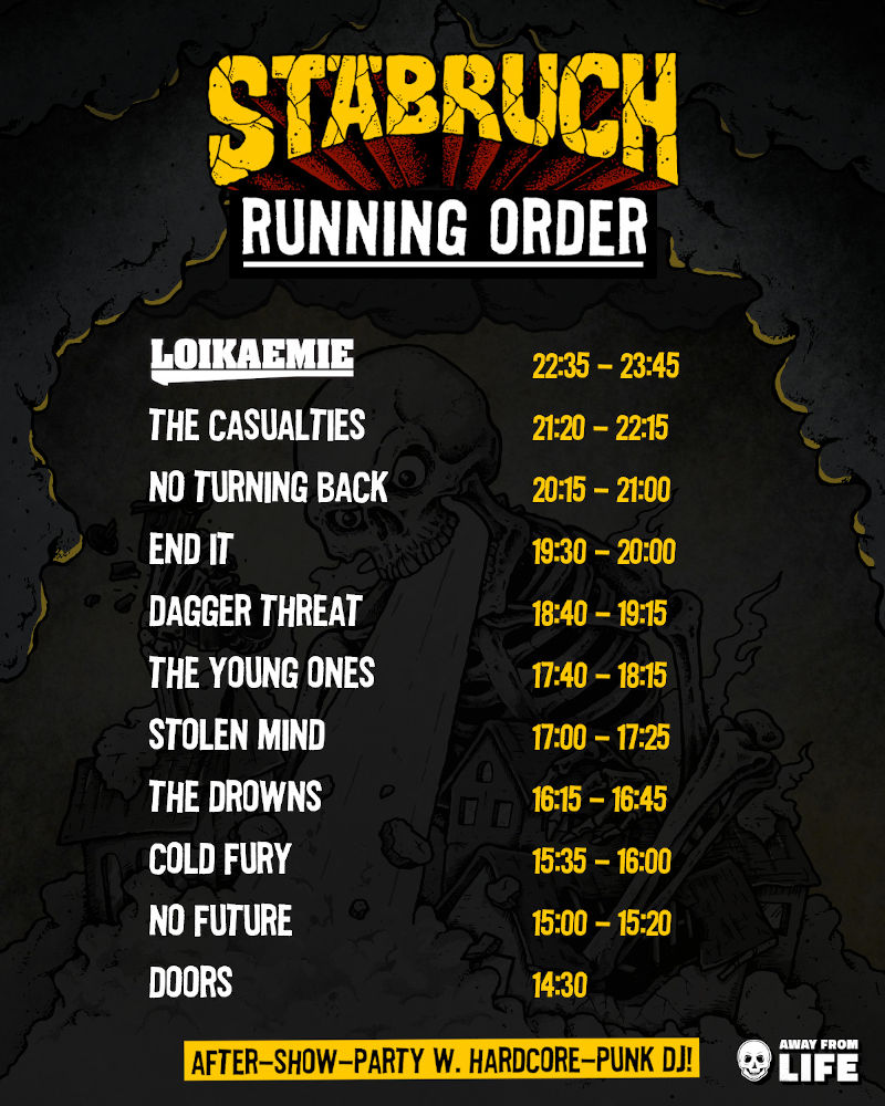 Mit ihrer neuen Single im Gepäck geht es für Loikaemie dann morgen nach Untererthal auf unser Stäbruch Fest. Dort werden neben Loikaemie außerdem Bands wie The Casualties, No Turning Back, Dagger Threat, End It und The Young Ones dabei sein.
