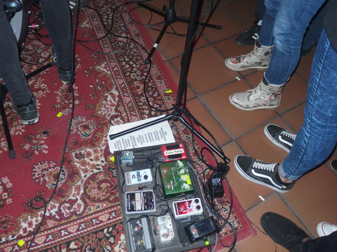 Lygo zeigten dann, warum sie damals von Kettcar als Ersatz für Love A ausgewählt wurden (wir berichteten). Damals hatten sie souverän die Stadienauftritte gemeistert, doch jetzt im kleinen Rahmen zeigt sich das Potential der Band. Schon krass, wie intensiv so ein Clubkonzert werden kann. Gerade die räumliche Enge machte sich hier bemerkbar. Blöderweise musste ich kurz nach Beginn kurz raus. Als ich dann wieder reinkam, blieb ich im Türrahmen stehen und musste aufpassen, dass ich nicht auf dem Effektboard rumtrat. So hatte ich dann auch immer die Setlist im Auge 😉 (siehe Galerie). Einen Zwischenfall gabs noch mit einer Box, die von der Theke fiel… Schwerkraft und so. Zum Glück war das Schlagzeug etwas weiter weg positioniert, so das nix passierte.. Als dann beim dritten oder vierten Song der Pogo losging, konnte ich gerade noch eine Zuschauerin aus der ersten Reihe auffangen (zweimal sogar). Lygo machten dazu dann auch noch eine Ansage, das man auf sich aufpassen soll. Aber so schlimm wars dann auch nicht. Die Songauswahl war super, ich glaube, sie haben jeden Hit gespielt, dazu auch die beiden Tracks von der neuen Single Kloß im Hals. Eben den Titeltrack und eine Neuaufnahme von Zeit für Dich. Der Wecker, der als Coverartwork dient, war auch ins Bühnenbild integriert. An Besonderheiten gab es dann noch Leben wert, einen Song, den sie zusammen mit Heisskalt und Lirr geschrieben haben.