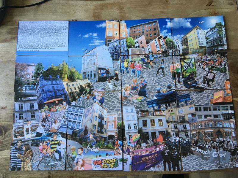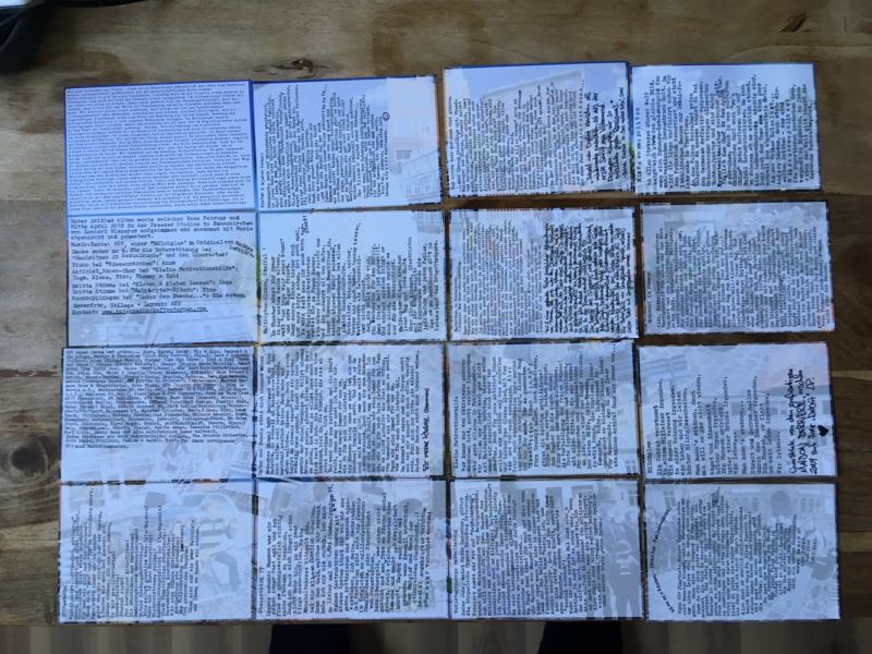 Zu jedem Text wurde ein eigenes Textblatt gedruckt. In der Summe ergibt dies ein großes Bild. Sehr einfallsreich.