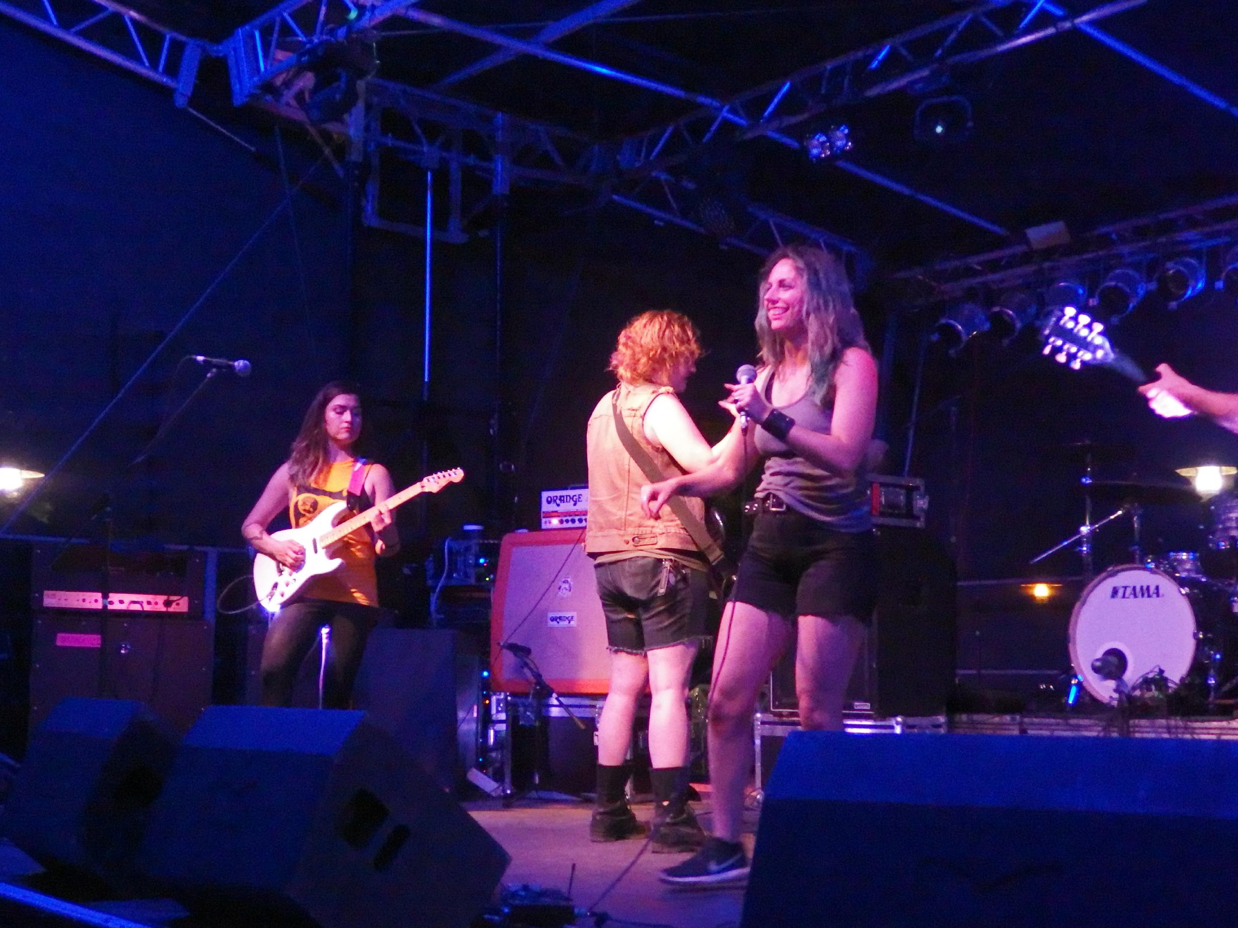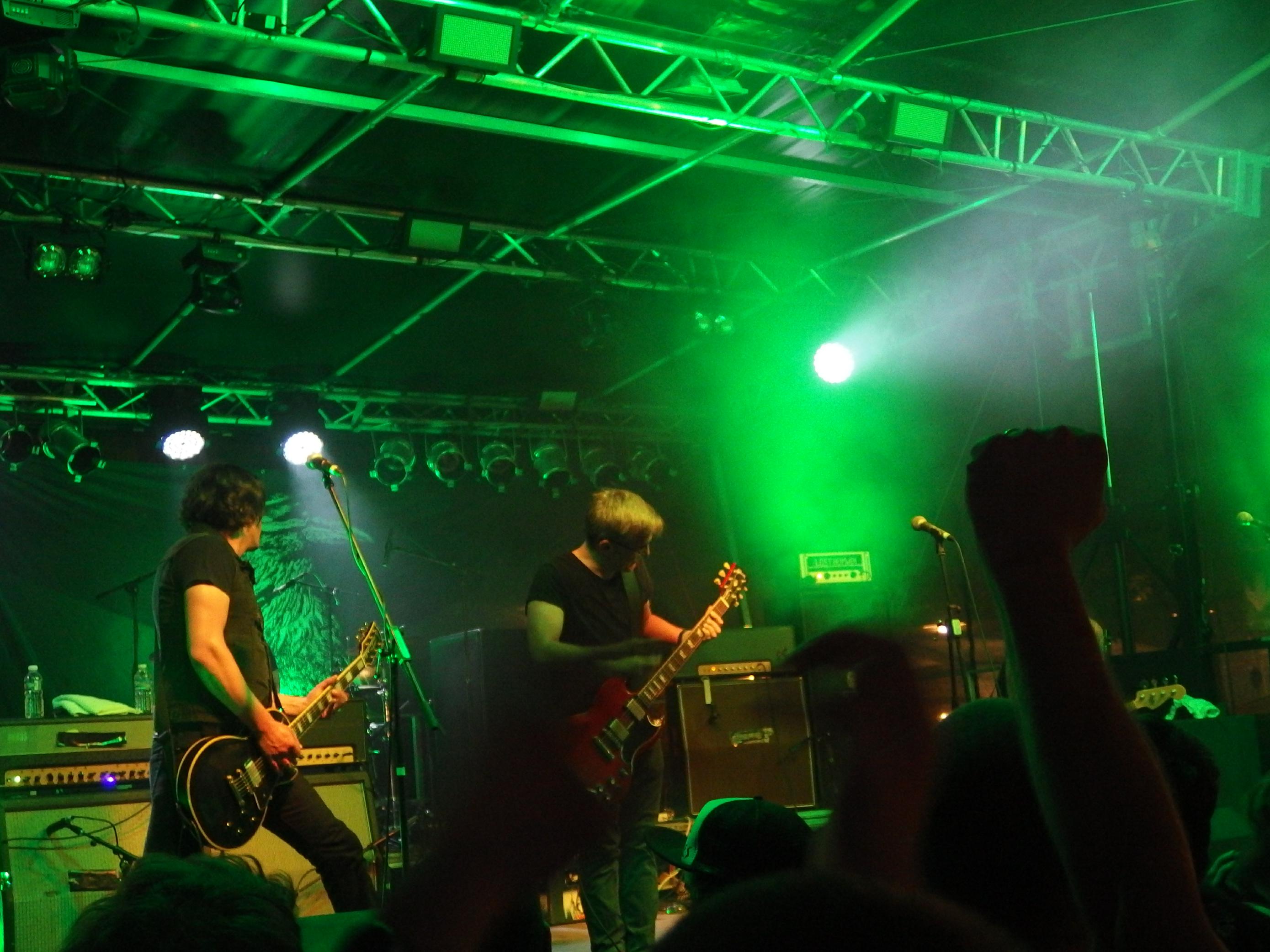 Fast pünktlich gegen 21 Uhr betraten die Damen und der Herr von War on Women die Bühne. Die Selbstbeschreibung im Programmheft „feministischer Hardcore aus Baltimore“ klang ja erstmal, na, so nach „gähn“ und linkem Spießertum im Rahmen der Emma. Das war dann aber doch ganz anders. Äußerst hektischer Hardcore, ziemlich genial gespielt und dazu eine Frontfrau, die ihren Namen auch wirklich verdient. Preaching to the converted gabs hier im Übrigen auch nicht, denn das Publikum war bunt gemischt. Die natürliche Sprachbarriere dürfte allerdings das Verständnis erschweren, so dass man wohl nicht erwarten darf, dass der Griff an die eigene Muschi bei jedem Konzertseher/-hörer auch richtig angekommen ist. Sie zogen auf jeden Fall sehr viele interessierte Blicke auf sich und machten Freude. Der Platz vor der Bühne war gut gefüllt, dennoch gabs außer viel Applaus nur wenig Bewegung vor der Bühne. Neben einigen politischen Songs gabs auch ein paar schnellere Funsongs. Das Programm dauerte eine gute Dreiviertelstunde und war ein grandioser Einstieg in den darauffolgenden Wahnsinn.