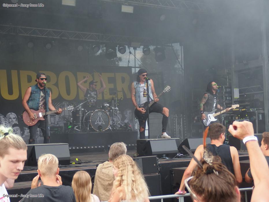 Danach wurde es aber vorne richtig voll. Turbobier kommen bekanntlich aus Wien-Simmering und sind eine dialektal geprägte Punkband. Das macht die Musik natürlich etwas gewöhnungsbedürftig, weil man vieles von den Texten nicht so gut versteht. Das gilt natürlich nicht für Bayern. Auch in Österreich wird ja bairisch gesprochen, eben mittelbairisch, von daher war die Band auf dem Open Air gut aufgehoben. Aber das erklärt auch, warum die Band in ihrem Heimatland auf Platz 1 der Charts war und sie hier kaum einer kennt. Außer auf diesem Open-Air, denn es wurde vorne knüppelvoll. Zwei Alben, Irokesentango und das neue Festament hat die Band zwischenzeitlich veröffentlicht. Ihr erster Hit war Arbeitslos durch den Tag, für das sie sogar die Genehmigung von der Songwriterin erhielten (nein, das war nicht Helene Fischer) um ihren doch recht despiktierlichen Text drüberzulegen. Ja, das durfte natürlich an diesem Tag auch nicht fehlen. Turbobier sind nicht ganz unumstritten, weil sie ja bei einem Label gesignt waren, was man gewöhnlich Majorlabel nennt, nämlich Warner Music. Aber nicht nur optisch kommen sie wie eine ganz normale Punkband rüber: Schlagzeuger im Casualties-T-Shirt, Sänger mit Misfits-Schädel auf der Jacke, läuft. Nein, mittlerweile auch mit eigenem Label und ihrer eigenen Variante der APPD, der Bierpartei nämlich. Weniger credibil sind natürlich die zum Teil recht fragw+ürdigen Spaßtexte wie Feuerwehrfestl oder Saufhits wie Fettsein ist ein Menschenrecht (Fett hier im Sinne von betrunken) sowie Sauf i aus (ein umgetextetes Taylor-Swift-Cover), sind aber auch gesellschaftskritische Werke wie Mensch is a Mensch auf ihren Alben (und auch auf dem Konzert) vertreten. Live sind sie schon sehr lustig anzusehen und sie bringen auch genug Power, um den mittlerweile rappelvoll gefüllten Platz zu unterhalten. Ob allerdings die hinteren Massen mit ihrer Titulierung als Sitzptotestler und Radlertrinker so einverstanden sind? (Hypothesee: Radlertrinker ist in Österreich anscheinend ein Schimpfwort für Nichttrinker.) Allerdings hat insbesondere Sänger Marco Pogo (sic!) ein Problem damit, die Klappe zu halten. So folgen auf etwa ein- bis zweiminütige Songs etwa fünfminütige Redeanteile. Zum allen Überfluss wird auch noch ein fünfminütiges Bass-Solo ausgepackt, weil Bassist Baz Promüü heute Geburtstag hatte… Uff. Aber ansonsten war der zweistündige Gig allererste Sahne. Zum Abschluss gabs mit Verliebt in einen Kiwara (das ist österreichisch für „Bulle“) einen Anti-Polizei-Song und ihren Hit Fuassboiplotz.