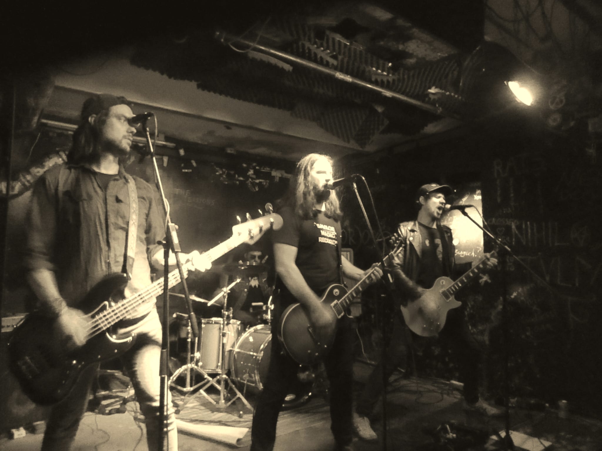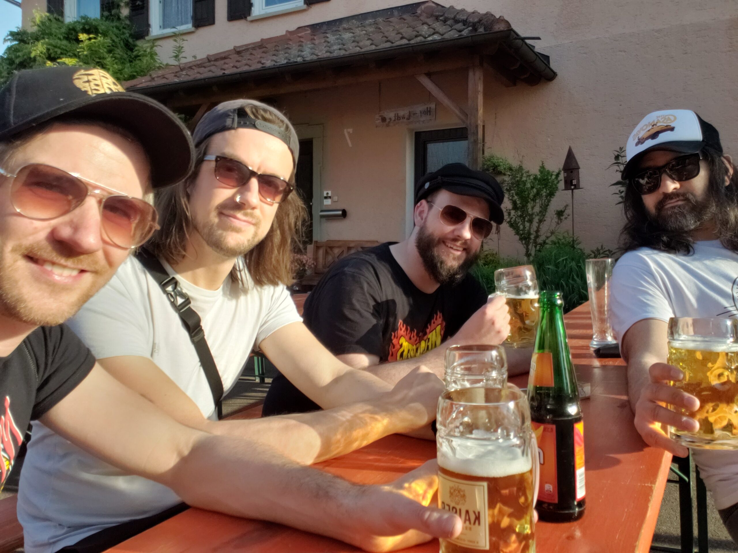 Bei bestem Wetter kommen wir nach ca. 3 Stunden Fahrt inmitten des jährlichen Mai-Dorffests an. Trotz ausgelassener Stimmung bei Bier, Bänken und Blasmusik ziehen wir natürlich einige Blicke auf uns. Nachdem wir erstmal die Location von den Einwohnern erfragt haben, parken wir den Bus um und werden von Georg, dem Veranstalter, Techniker, Wirt und Gastgeber in Personalunion begrüßt. Load-in bei ca. 20° C Temperaturabfall – der Stollen ist ein Steingemäuer und befindet sich einige Meter unterhalb des Dorfes. Noch ein köstliches, kühles Blondes im Sonnenschein genießen, bevor der Soundcheck ansteht. Nach dem Soundcheck wird uns erst die Gesamtsituation bewusst: Stollen im Keller, Gitarrenwerkstatt im Erdgeschoss, Wohnbereich darüber, alle Flure mit teils bizarren Holzskulpturen geschmückt – im ganzen Haus wird Kunst und RnR gelebt! Georg ist zugleich Lebens- und Überlebenskünstler.