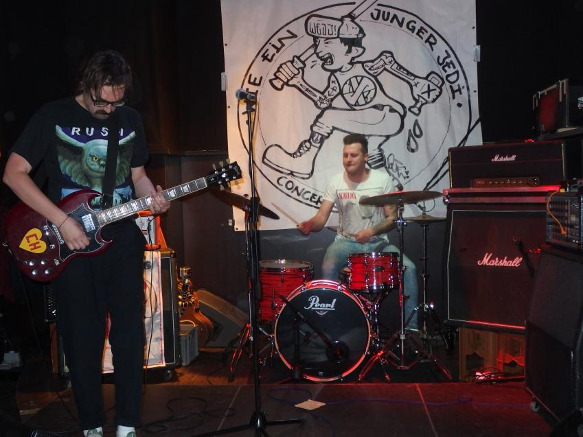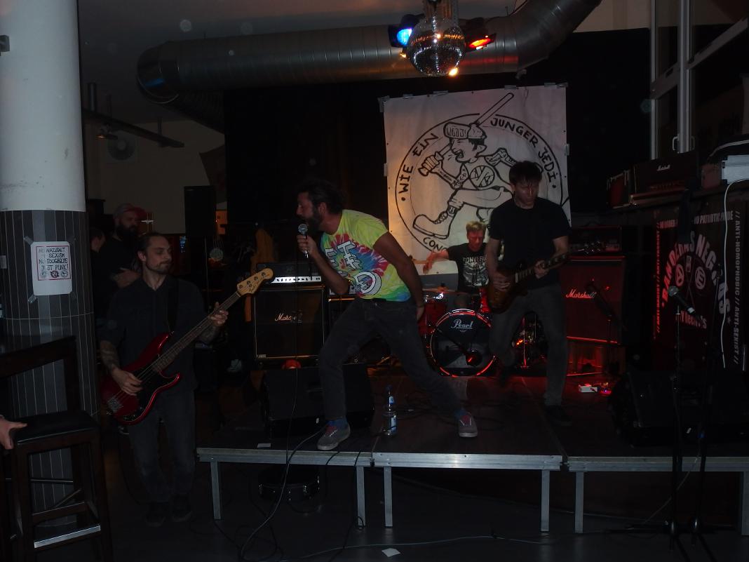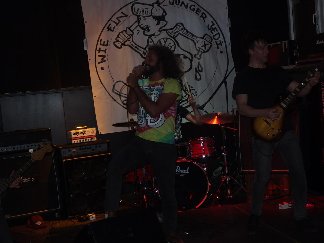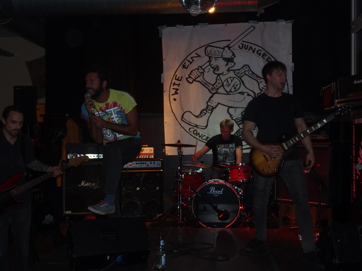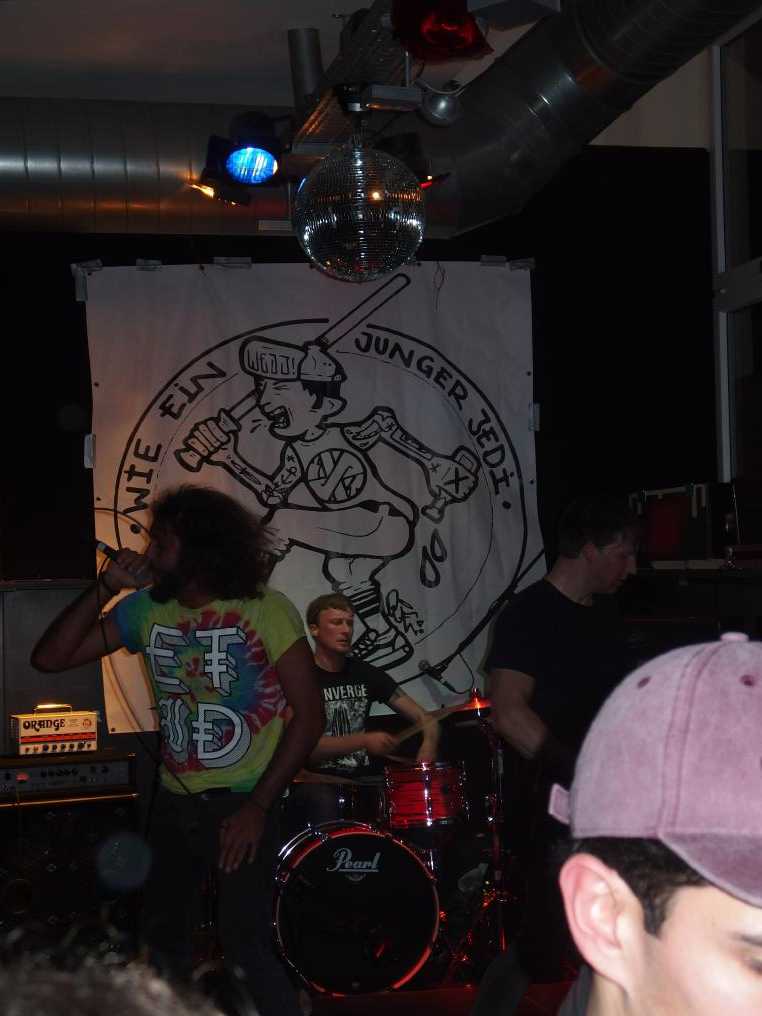 Terrorfett kommen aus Karlsruhe, hinterm Schlagzeug sitzt der Besitzer der Alten Hackerei, vorne einer seiner Thekenboys, der für den Gesang zuständig ist. Daneben noch ein weiteres Bandmitglied. Nun, diese Band gibt keinen Fick, wie man heute wohl so sagt. Deutschpunk alter Schule, so im Stile von Toxoplasma, Hammerhead, Boskops hatte ich noch im Kopp, aber natürlich auch Bands des neuen Jahrtausends wie Abfukk oder Kotzreiz kann man wohl als Einflüsse geltend machen. Und so ging es textlich natürlich auch gegen Trump, Jesus und man fordert auch Krebs für Gauland. Gerade letzterer Song, mit Video dürfte die Band wohl bekannt gemacht haben. Etwas Punkrock-Nachhilfe gabs auch noch: Wonderfull von den Circle Jerks wurde zu Wundervoll und als vorletzten Song spielte die Band High on War von Beton Combo, zudem trug der Bassist ein Tin Can Army-Shirt. Ansonsten war kein Lied über zwei Minuten. Ein kleines bisschen Pogo gabs auch zu sehen, also vom Publikum.