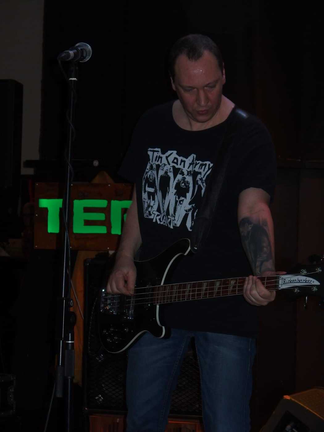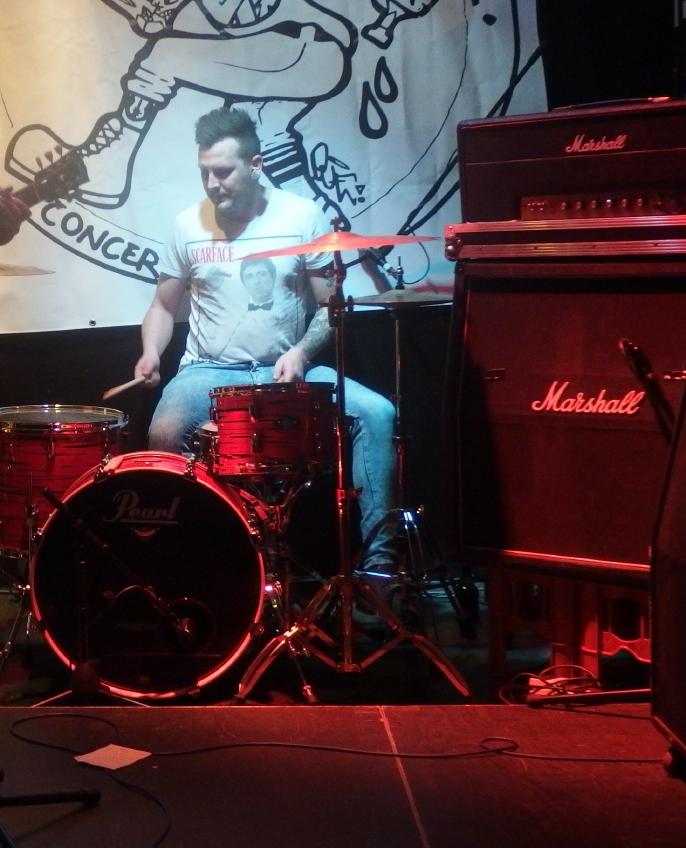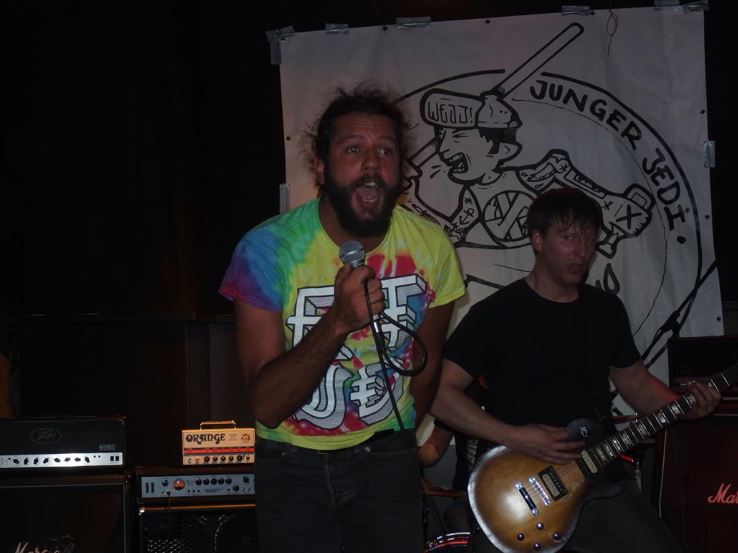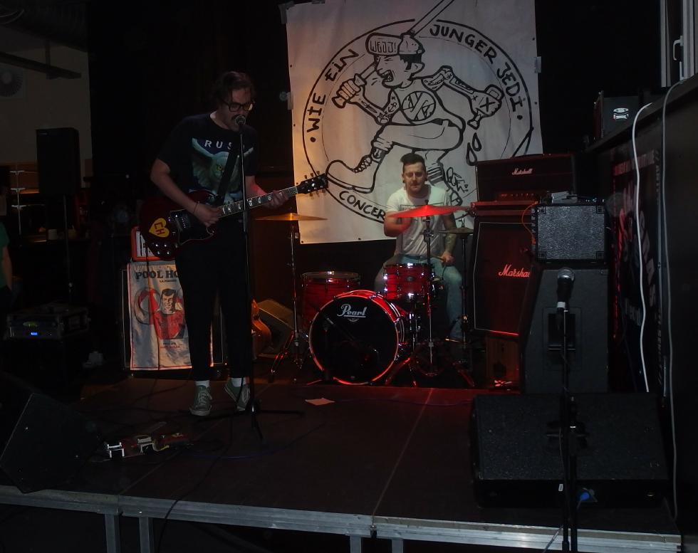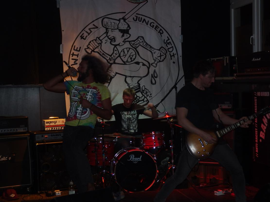 Terrorfett kommen aus Karlsruhe, hinterm Schlagzeug sitzt der Besitzer der Alten Hackerei, vorne einer seiner Thekenboys, der für den Gesang zuständig ist. Daneben noch ein weiteres Bandmitglied. Nun, diese Band gibt keinen Fick, wie man heute wohl so sagt. Deutschpunk alter Schule, so im Stile von Toxoplasma, Hammerhead, Boskops hatte ich noch im Kopp, aber natürlich auch Bands des neuen Jahrtausends wie Abfukk oder Kotzreiz kann man wohl als Einflüsse geltend machen. Und so ging es textlich natürlich auch gegen Trump, Jesus und man fordert auch Krebs für Gauland. Gerade letzterer Song, mit Video dürfte die Band wohl bekannt gemacht haben. Etwas Punkrock-Nachhilfe gabs auch noch: Wonderfull von den Circle Jerks wurde zu Wundervoll und als vorletzten Song spielte die Band High on War von Beton Combo, zudem trug der Bassist ein Tin Can Army-Shirt. Ansonsten war kein Lied über zwei Minuten. Ein kleines bisschen Pogo gabs auch zu sehen, also vom Publikum.