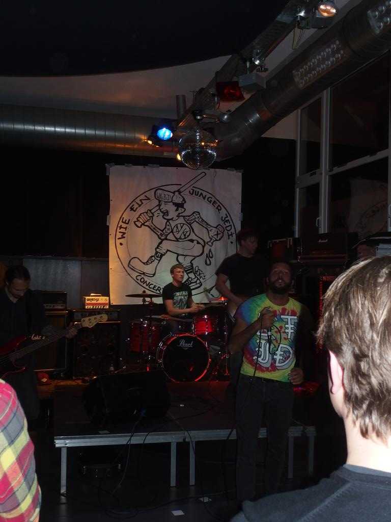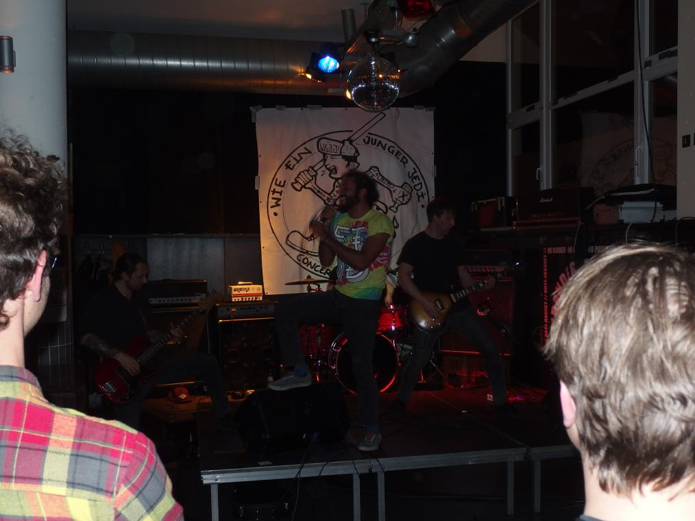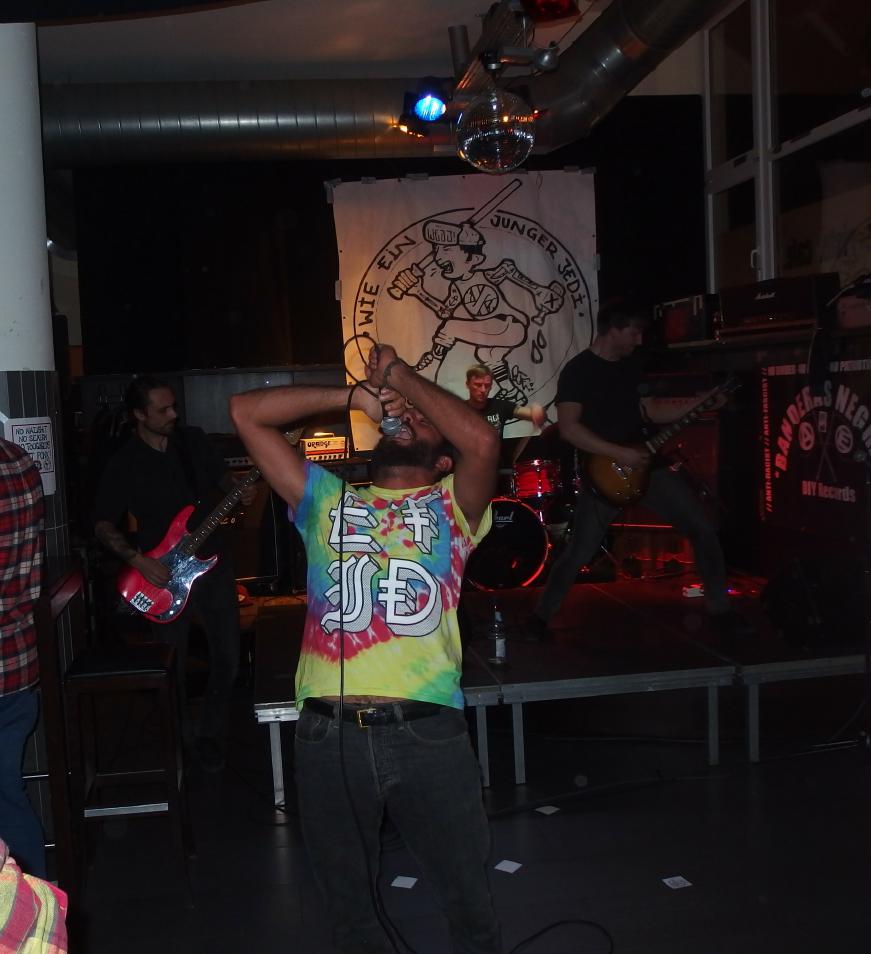 Lavatch aus Köln waren als nächste dran. Die Band dürfte wohl relativ bekannt sein. Die DIY-Punks mischen ihren Hardcore-Punk ebenfalls mit interessanten Einflüssen, nämlich Southern Rock und passten damit gut als Zwischending. Interessant auf jeden Fall die T-Shirt-Wahl des Sängers mit seinem Batik-Motiv. Hier gab es nun auch die beliebten Kletteraktionen zu sehen, die man in solchen Bars immer mal wieder machen kann. Leider dauerte der Auslöser immer so lange… So hoch wie bei Campino gings dann aber nicht. Etwas mehr Bewegung als bei Pool Rules und der laden war nun auch gut gefüllt. Schöne Show. Letztes Album ist auch etwas her, mal gespannt, wann was neues kommt.