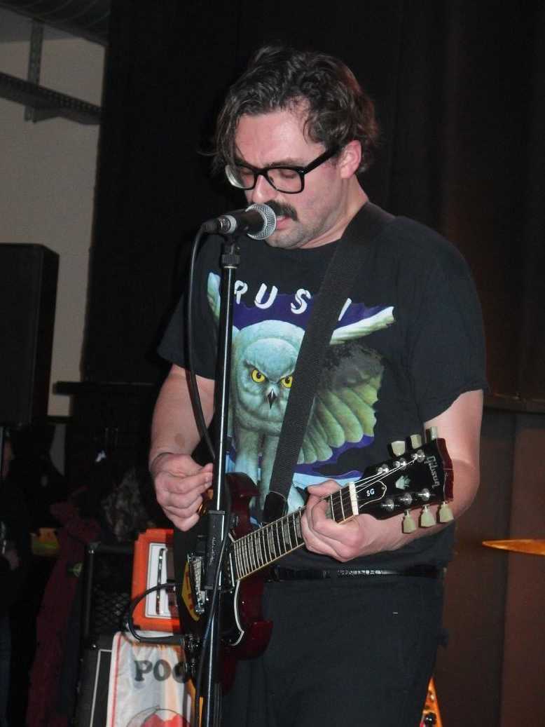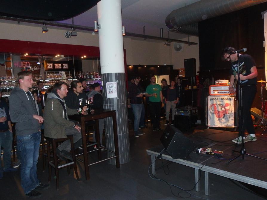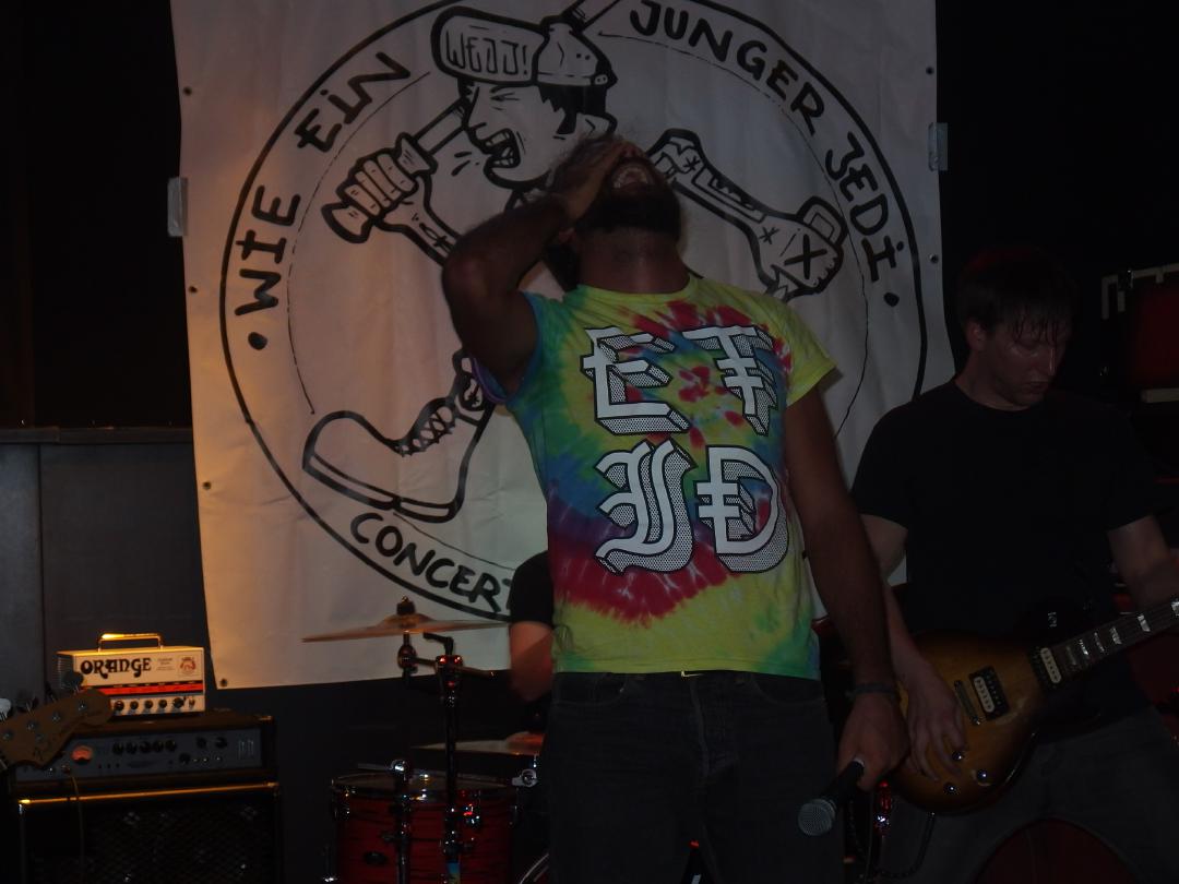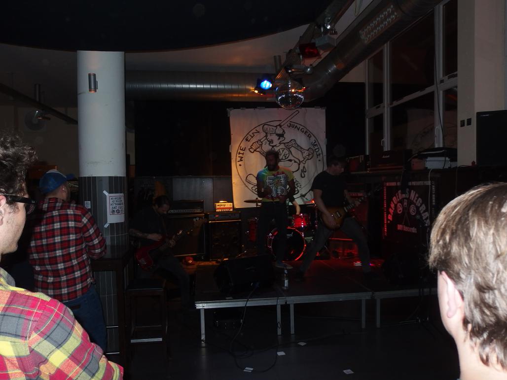 Ich hab mich sehr gefreut, Pool Rules zum ersten Mal zusehen. Zwei Mal schon verpasst, das Demo schon seit Monaten rumliegen und noch nicht gehört, eine Schande! Dabei besteht die Band doch zur einen Hälfte aus Baby Lou (Marco Korz), der vermutlich besten saarländischen Band, die sich aber leider aufgelöst hat, und der anderen Hälfte Finding Faith (Daniel Meiser), ebenfalls eine grandiose, aber wenigstens wieder existierende, saarländische HC-Band. Richtig gelesen, es gibt nur Gitarre, Schlagzeug und Gesang. Das macht aber nix. Wie bereits bei Baby Lou (man erinnere sich an „That’s the reason why I’m King of Blieskastel“) gefällt die Band durch irrsinnige Wortspiele und daher abstruese, aber doch interessante Texte. So hören die Songs auf Namen wie Puddles in the Street with gasoline Rainbows on It oder Ketchup in the Rye. Musikalisch gabs soliden Punkrock, getreu des T-Shirts von Marco (Rush – kanadischer Progressive-Rock) gewürzt mit einigen Rockelementen. Das Publikum war nicht direkt aus dem Häuschen, aber doch ganz angetan hatte man so den Eindruck.hat auf jeden Fall Spaß gemacht. Vor kurzem erschien digital über Midsummer Records und physisch (als Tape) über Buddy Building Records eine Split-Veröffentlichung mit Community Service. Hört mal rein…