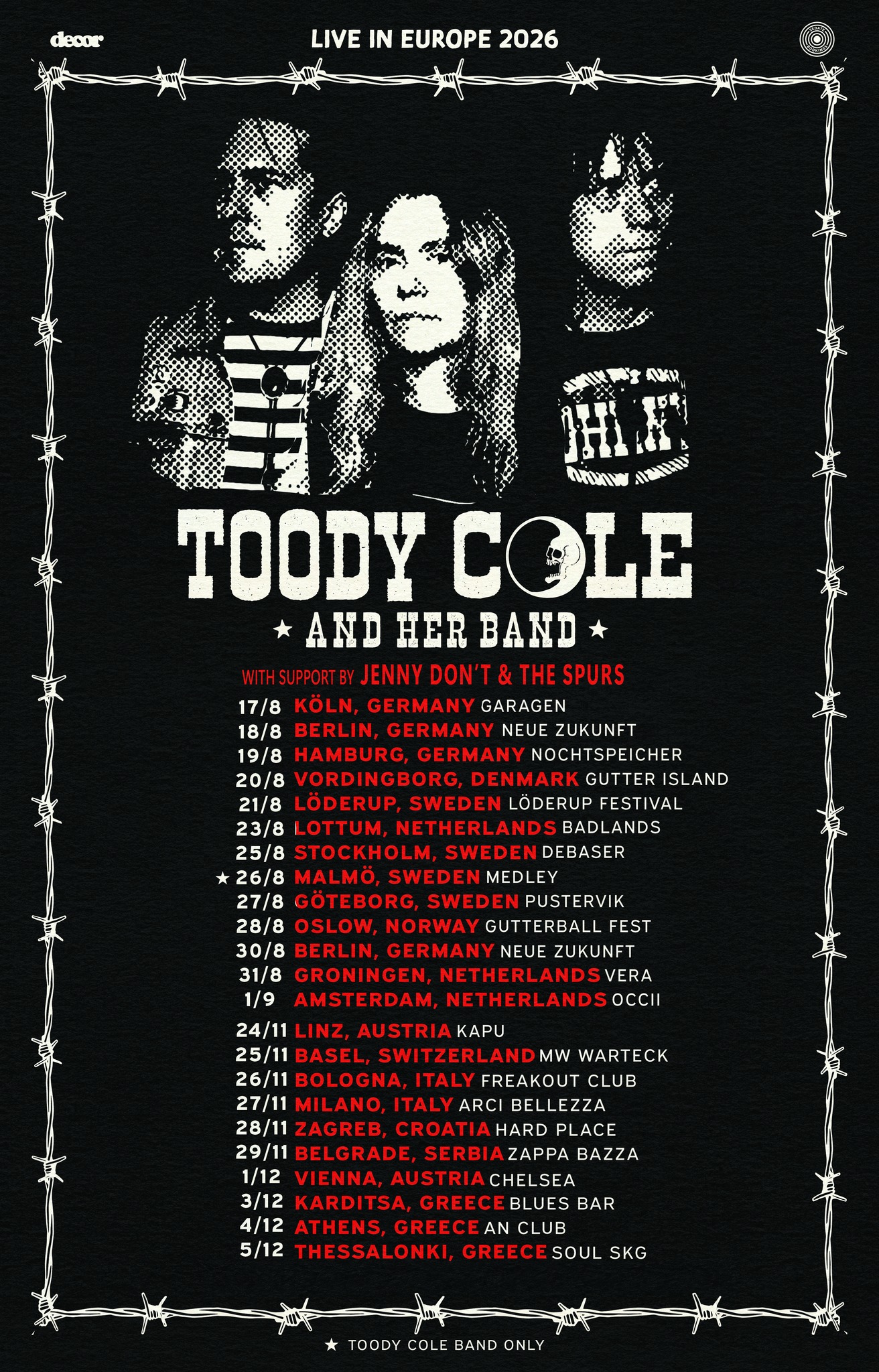 Toody Cole war eins Bassistin der legendären Dead Moon. Leider sind ihr Mann Fred Cole und Drummer Andrew Loomis inzwischen verstorben. Nun tourt sie wieder, ihre Band besteht aus Mitgliedern von Jenny Don’t & The Spurs, welche auf der Tour auch Vorband sein werden.