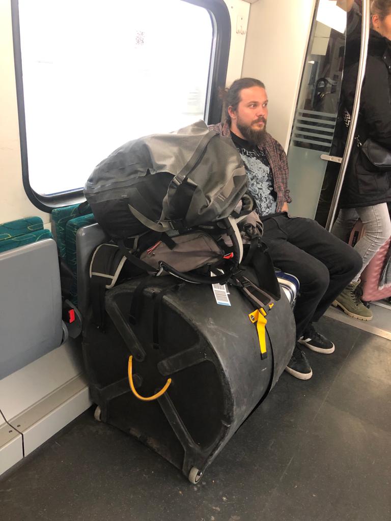 Zunächst musste Michi’s Setup aus zwei Gitarrenverstärkern, einem Bassverstärker und einem Quadratmeter Pedalboard auf Reisegepäckgröße geschrumpft werden. Diesen Job übernahm nach einigen Stunden Programmierarbeit ein Helix von Line6. Die Gitarre wurde auseinander geschraubt und in Einzelteilen zusammen mit Becken und Kabeln auf diverse Handgepäckstücke und ein Bassdrumcase aufgeteilt.