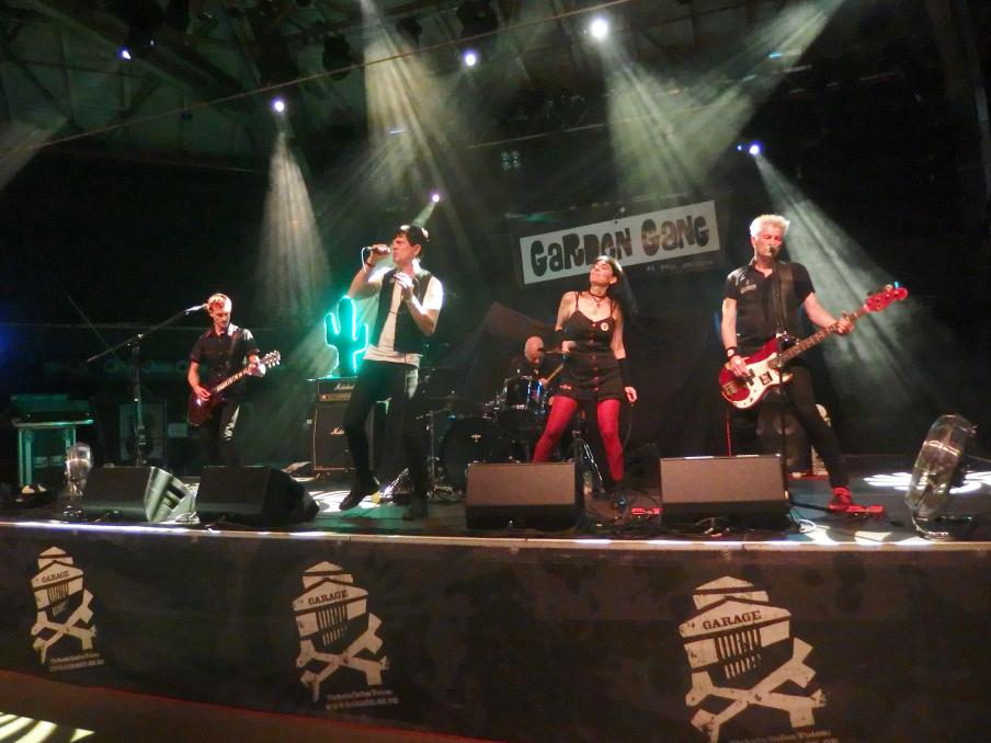 Am Anfang sah es nicht so aus, denn als die Münchner von Garden Gang das Konzert gegen 19:30 eröffneten, befand ich mich in der zweiten Reihe… Gut zehn Meter von der Bühne entfernt. Der frühe Beginn ist freitags in der Garage notwendig, weil anschließend immer noch Diskobetrieb ist. So bekamen viele gar nicht die durchaus interessante Mischung aus Punk, Beat und Rock & Roll mit, die die Band seit fast 30 Jahren umtreibt. PamP, einziges verbliebenes Originalmitglied, machte gute Meine zum bösen Spiel und lieferte einen prima Gig ab. Ebenso wie seine Gesangskollegin Ann Dee, die sich reichlich Mühe gab, im Stile einer Rocky Horror Picture Show zu tanzen. Nur hörte man die Dame nicht… Es gelang der Band leider nicht, die halbkreisförmige Formation des Publikums zu durchbrechen. Zum Glück zeigten einige Fans doch, dass die Band ihnen durchaus gefiel. Auch am Merchandise-Stand war nachher noch Bewegung zu sehen.