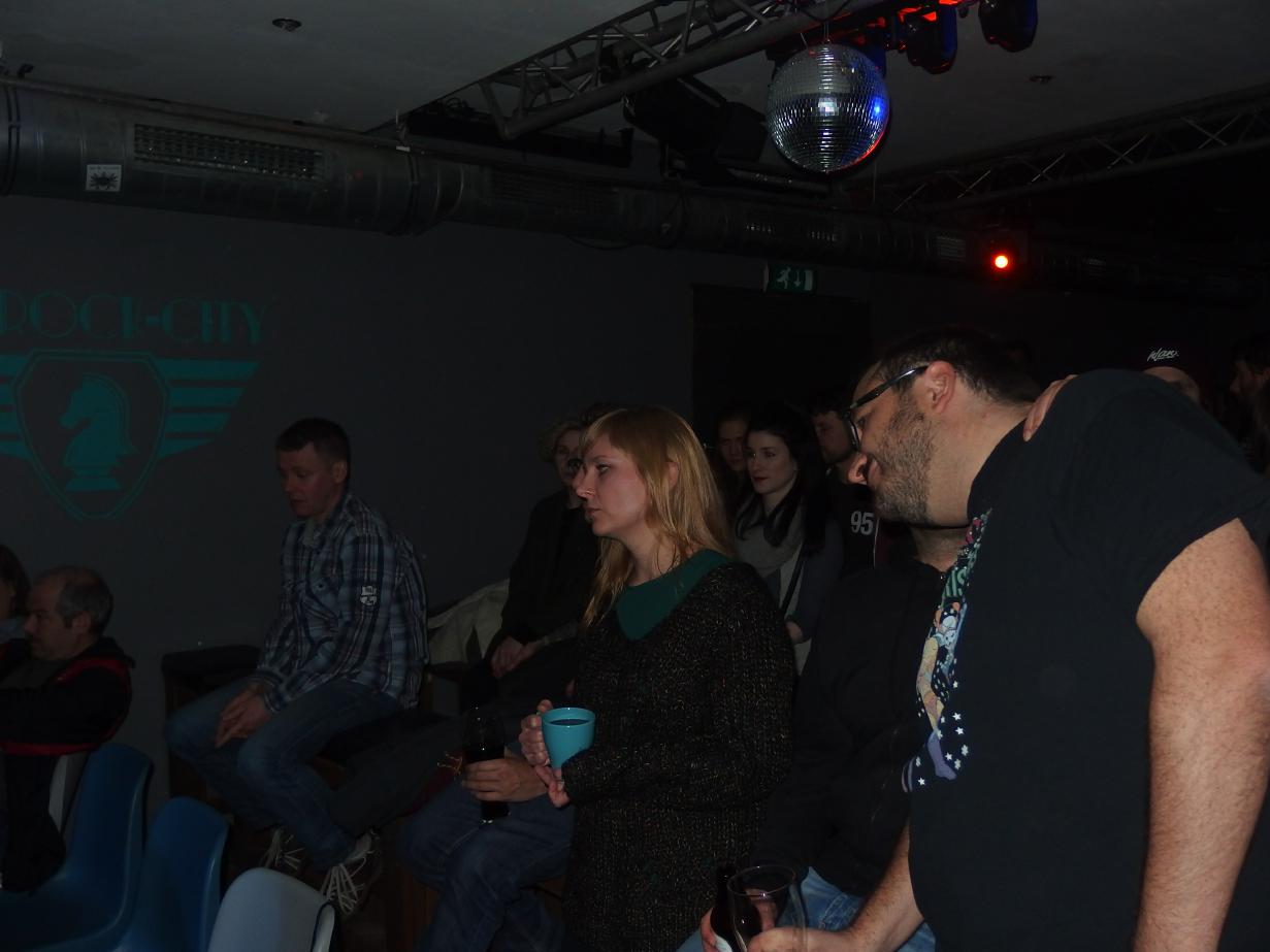 Zeit das Ambiente zu beschreiben. Wie bei jedem Abend gab es Glühwein und Guinness. Der leckere Apfelglühwein war relativ schnell ausverkauft, das Guinness floss noch etwas länger. Draußen gab es Alternative-Hits von den 1990ern bis hin zur Neuzeit und als kulinarischen Leckerbissen Pommes und Currywurst. Pommes für eine Mark… krass!