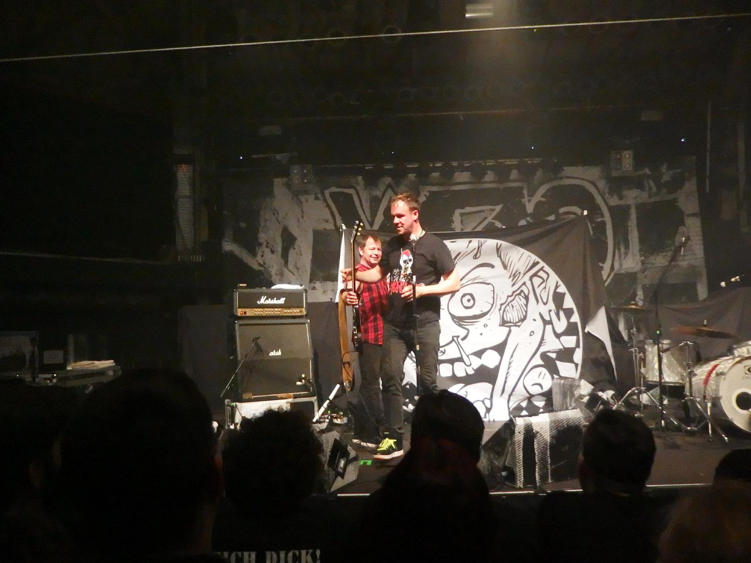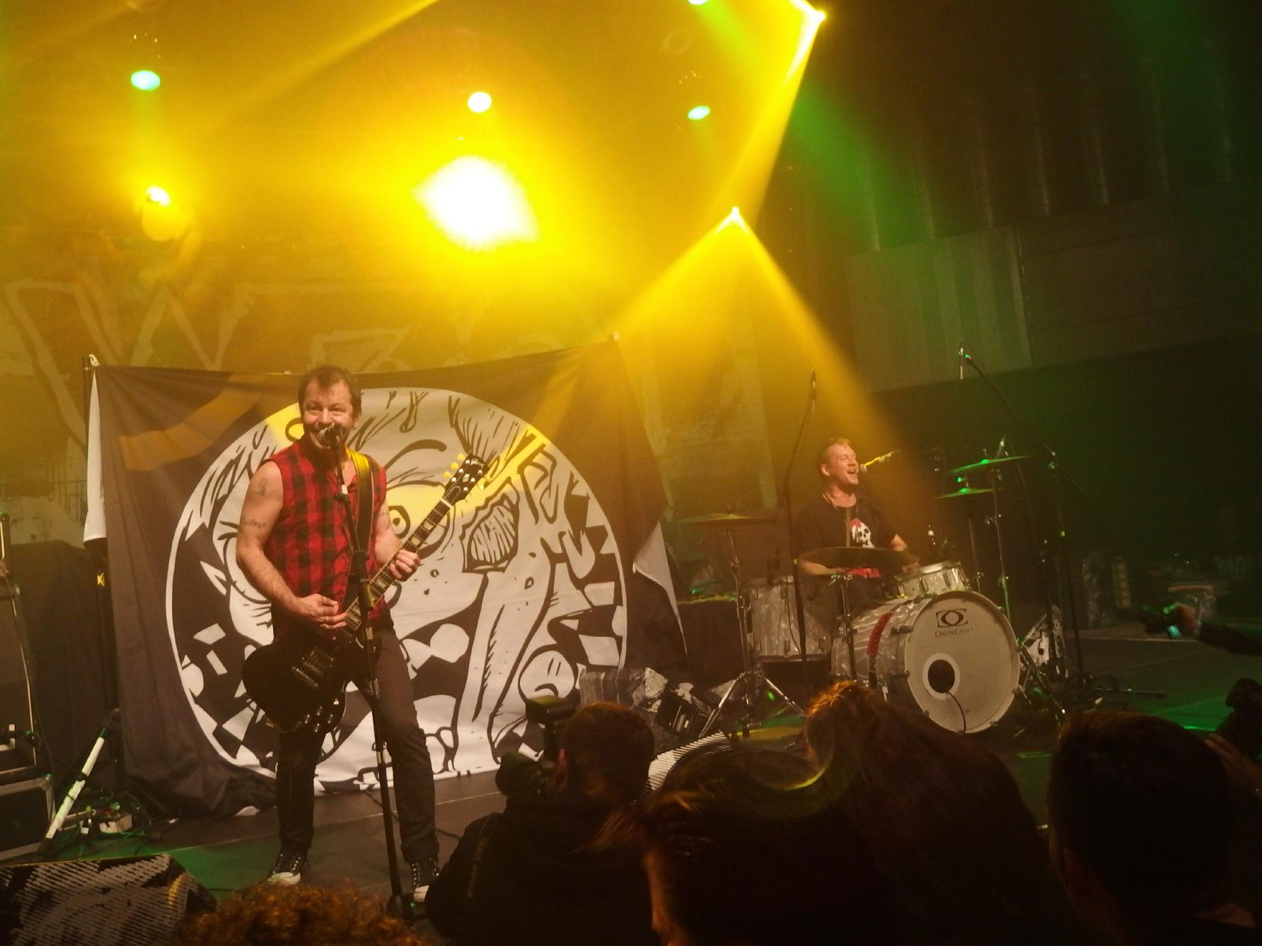 Die Abstürzenden Brieftauben haben vor kurzem erst ein famoses neues Album hingelegt. Unser Review zu Doofgesagte leben länger findet sich hier. Dem Kollegen kann ich bedenkenlos zustimmen, ein fantastisches Album einer lange tot geglaubten Band. Mit Olli Bockmist am Schlagzeug und dem alten Schlagzeuger Mirco „Micro“ Bogumil hält das Duo die Fahne des lange totgeglaubten Funpunk hoch, inklusive klarer antifaschistischer Bekenntnisse. Ich war gespannt, wie die Band mit dem neuen Material klar kommt und freute mich eigentlich mehr auf die Tauben als auf Wizo. Nun, enttäuscht wurde ich auch nicht. Los gings mit Das Grauen Teil 3. Die beiden harmonieren sehr gut zusammen und schaffen eine würdevolle Weiterführung des mit dem viel zu früh verstorbenen Konrad Kittner begonnen Projekts. Ein paar Dinge trübten jedoch die Show. Offensichtlich war niemand da, der der Band genau sagte, wie lange sie spielen durften, so dass es ab und an zu etwas irritierenden Momenten kam. Auch fand ich, dass der Fokus zu sehr auf den alten Stücken lag. Immerhin haben die zwei ein bärenstarkes Album veröffentlicht, das will nun mal auch promotet werden. Naja, es war auf jden Fall für alte und neue Fans genug dabei. Nie wieder Pegida ist ein super Ohrwurm (leider stößt mir dabei die Textzeile Geistig behinderte Neofaschisten übel auf!) und zur Überraschung aller kündigte die Band auch eine neue Single namens Frauke, Halt’s Maul an und spielten das Titellied. Zwischendurch wurden auch mal die Instrumente gewechselt. Auf der Tanzfläche war auch ein bisschen was los. Was fehlte: Ganz klar Die Blumen sind für die, Herr Polizist, im Original von Heidi Franke udn ein Highlight des an Highlight reichen neuen Albums. Stattdessen gabs Ich will Spaßvon Markus, klar ein Standard der Band. Den alten Fans dürfte Im Strandbad gefehlt haben, das wohl zu proben vergessen wurde. Dieses wurde vehement gefordert, dann wurde stattdessen ein Medley gespielt. Naja, auch ok. Highlights neben den vorgenannten Songs: Steht ein Mädchen…, das gerne mitgesungen wurde, Keine Termine, das auf einem Harald-Juhnke-Zitat basiert, und die neue Taubenhymne Pieke Punk Guter Gig, sicherlich…