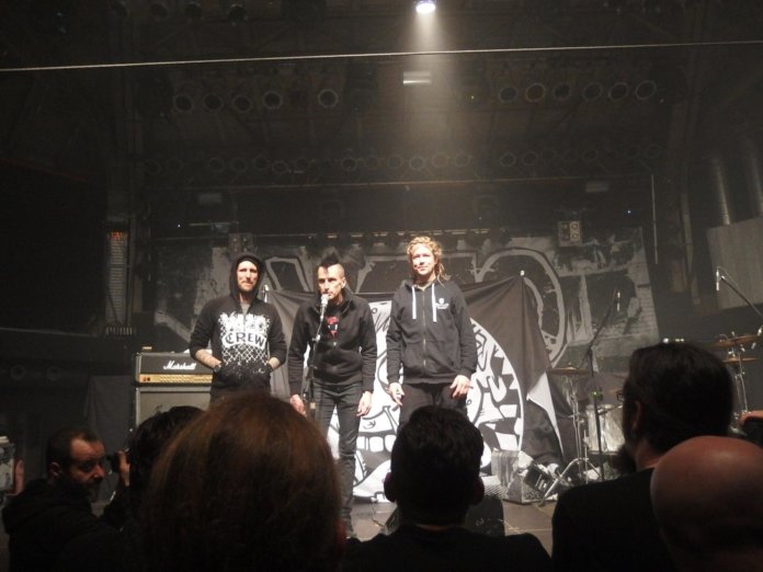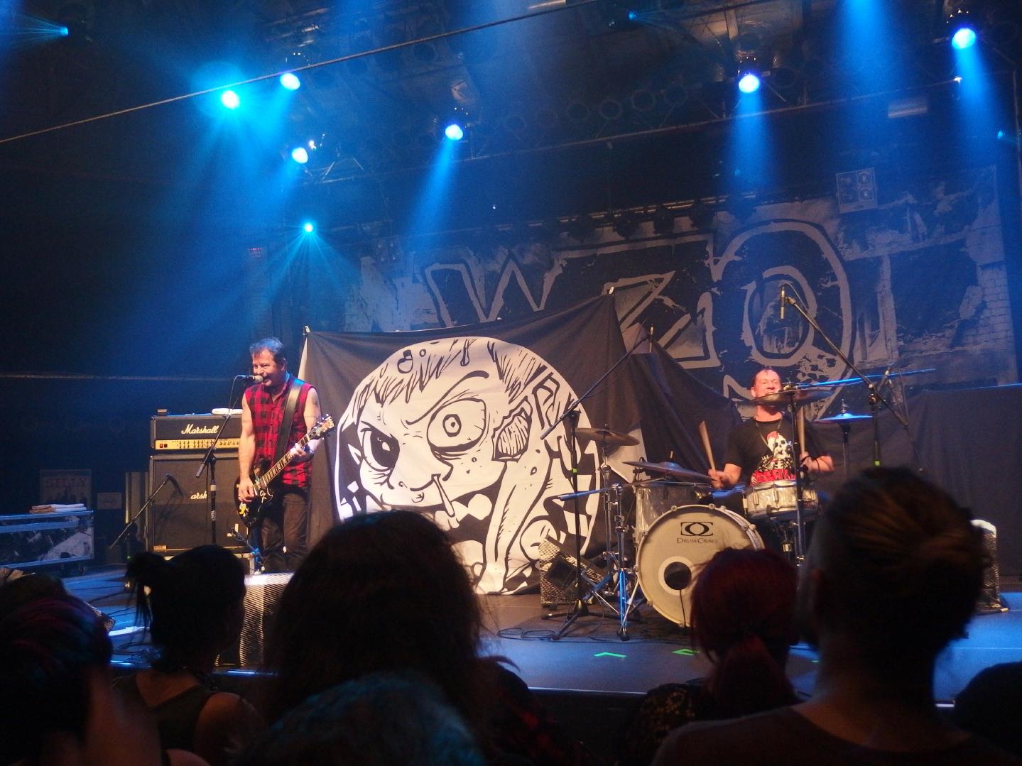 Aber dann doch nix im Vergleich zu Wizo. Verwunderlich eigentlich, denn deren beiden Comeback-Alben Punk gibt’s nicht umsonst! (Teil III) und das brandneue Der sind doch eher so naja. Klar, ein paar gute Lieder, aber auch viele Füller und zum Teil ziemlich dämliche Texte. Doch Wizo brannten an diesem Sonntag klar die Hütte ab. Bei dem Punkfest blieb glaube ich kein Auge trocken. Eröffnungssong das Highlight von Der: Adagio Danach begann eine Zeitreise, die immer wieder von Anfängen wie Klebstoff bis hin zu neuen Krachern wie Ganz klar gegen Nazis führte. leider auch dabei: das peinliche Seegurke und das textlich platte Wahlkrampf. Aber vor allem die alten Hits kamen an: Raum der Zeit, Das goldene Stück Scheiße, Kopfschuss… Und war das ein gedränge vor der Bühne. Wirklich angenehmer Pogo. man musste eigentlich nicht viel machen, kurz in die Meute und schon war man am anderen Ende der Halle. Ein bisschen Crowdsurfing wurde auch zelebriert. Wer fiel wurde hochgehoben. So muss das sein. Die band war sichtlich gerührt vom Publikum und war auch scharf auf den dritten Gig ihrer Tour.
