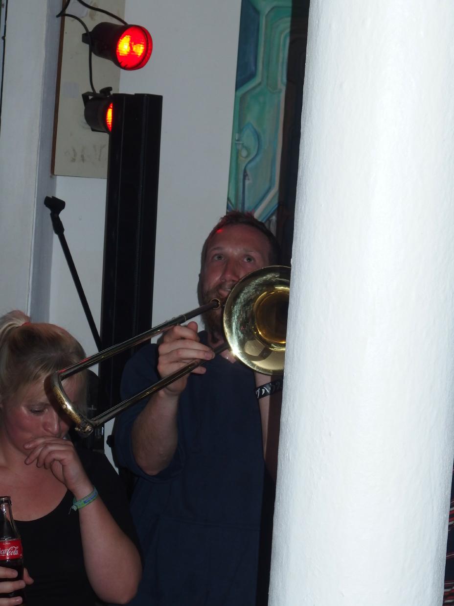 Wonk Unit treiben schon seit 2009 ihr Unwesen. Die britische Punkband aus London besteht aus mindestens zwei und maximal 8 Musikern, je nachdem wie groß die Gigs sind. So hatten wir an diesem Tag eine Sechs-Mann-Besetzung vor uns, zwei Gitarren, Bass, Schlagzeug, Sänger und Posaune. Wow, ziemlich eng auf der kleinen Bühne (naja, eher Ecke) und dann noch mit Pfosten in der Mitte. Nein, ein komplettes Bandfoto kann ich euch leider nicht bieten. Musikalisch, puh, Punkrock, im Stile des 1990er Skatepunk, Snuff hat man mir gesagt, live hatte ich eher Toy Dolls im Ohr, wenn auch etwas weniger klamaukig. Apropos klamaukig. Daddy Wonk, ehemals bei der Hardcore-Band The Flying Medaillons, Mainmann der Truppe ist ein echter Maniac. Alleine seine Dance-Moves sind schon genial. Zu jedem Song hat er eine Geschichte parat, zum Teil trägt er die Lyrics zunächst in Gedichtform vor. Mimik und Gestik lassen den typisch schwarzen Humor des Briten auch für ein deutsches Publikum verständlich werden. Beste Geschichte: Einmal im Zug habe er aus dem Fenster gepisst und nicht bemerkt, dass der Zug in den Bahnhof eingefahren sei. So habe er versehentlich einem Mann ins Gesicht gepisst. Zwar habe er sich bei dem Mann entschuldigt, doch im Nachhinein sei das der beste Tag seines Lebens gewesen. Wtf? Und von solchem Kaliber sind auch seine weiteren Geschichten, die alle in einem Song mündeten. Dann unterbricht er seine Performance urplötzlich, um Werbung für sein neues Lieblingsgetränk (Club Mate) zu machen…. ob er weiß, dass das eigentlich auch gerne als Hipster-Pisse umschrieben wird? Im Publikum ist außerdem eine junge Frau, die Geburtstag hat. Dieser widmet er das Lied Horses, im Übrigen auch eines meiner Lieblingslieder, das live dann aber viel härter als auf Platte ausfällt. Und so erzählt er immer weiter aus seinem Leben, zum Beispiel, dass er ein toller Stuckateur (Plasterer) ist, das er seine Frau liebt (I Love My Nagging Wife) und diese echt Glück mit ihm hat, weil er ein Genie ist (You Married a Tortured Genius), dass es furchtbare Jeans gibt auf der Welt (Awful Jeans) und irgendwie merkt man gar nicht, wie die Zeit vergeht und die Band tatsächlich 90 Minuten gespielt hat. Gegen Ende gabs dann auch ein kleines bisschen Pogo. Irgendwann geht der Hut herum und man gibt bereitwillig, weil man sich so gut unterhalten fühlt. Mit Old Trains ist dann endgültig Schluss und man wird in die doch recht kühle Saarbrücker Nacht entlassen.