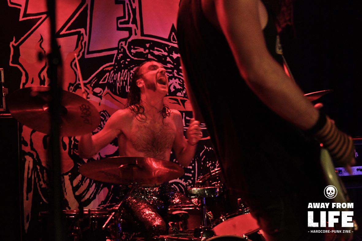 Warum wurde dann spätestens klar, nachdem Zeke ihr erstes Lied runter geballert haben. Ja, runtergeballert ist glaube ich der richtige Ausdruck. Zeke sind so wahnsinnig schnell, dass der Gig in Windeseile an einem vorbeizog. Aber wie sie selbst sagten: Rock’n’Roll ist nicht dazu gemacht, langsam gespielt zu werden. Wie mit Max und Chris‘ Bühnenpräsenz konnte man auch hier Parallelen ziehen. Bespritzte Sänger Chris das Publikum im viel zu heißen Klub, der sich auch in der Pause nicht richtig entlüften konnte, weil gerade die Welt unterging (Starkregen), erledigte das hier nonchalant ihr Bassist per Munddusche. Eklig eigentlich, aber wir waren schließlich alle auf einem Punknroll-Konzert, da darf man das. Respekt übrigens an den Papa, der seine ca. fünfjährige Tochter während des Gigs auf den Schultern trug. Respekt auch an die noch sehr junge Tochter, das sie überhaupt auf so ein Konzert mitgeht. Für Hörschutz war zum Glück gesorgt. Nachdem das Publikum bei den beiden Vorbands noch ziemlich zurückhaltend war, explodierte nun die Menge förmlich. Pogo war angesagt und man merkte allen Beteiligten an, dass sie Spaß an der Sache hatten. ganz ausverkauft wars wohl nicht, aber doch ziemlich voll.