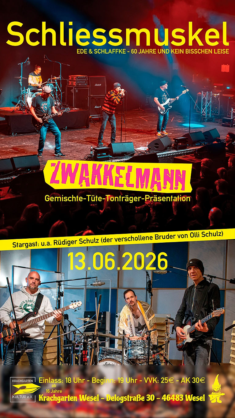 Gleichzeitig wurde ein Jubiläumskonzert zum 60-jähirgen Geburtstag von Schlaffke und seinem Bruder Ede angekündigt. Am 13. Juni 2026 werden Zwakkelmann und Schliessmuskel (in Originalbesetzung) ihre Diskografie im Krachgarten Wesel zum besten geben. Tickets gibt es hier.